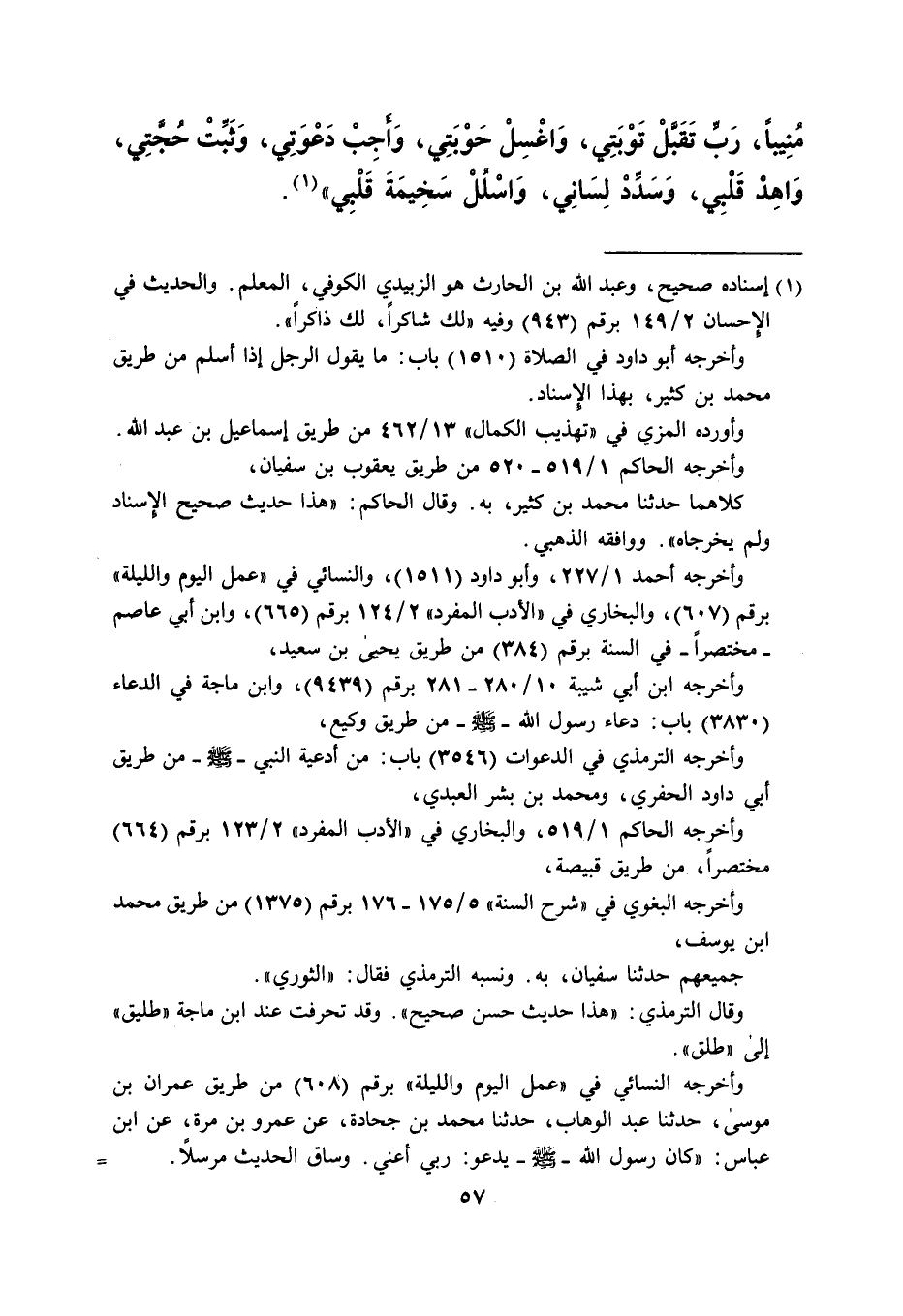 مُنِيباً، رب تَقَبلْ تَوْبَتِي، وَاغسِلْ حَوْبَتِي، وَأجِبْ دَعْوَتِي، وَثَبِّتْ خجَّتِي،