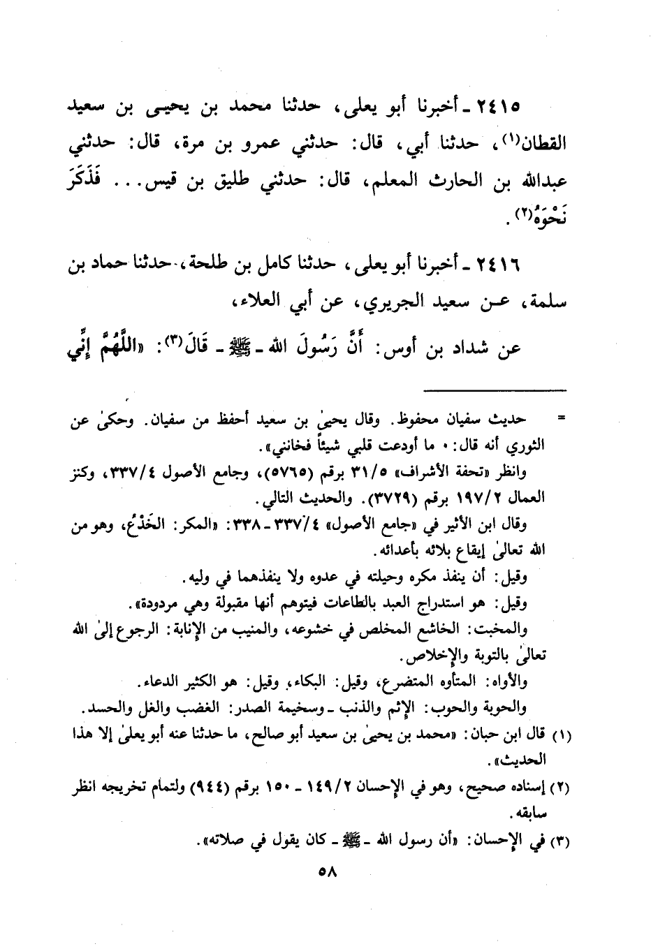 2416 - أخبرنا أبو يعلى، حدثنا كامل بن طلحة،- حدثنا حماد بن سلمة، عن سعيد الجريري، عن أبي العلاء، عن شداد بن أوس: أنَّ رَسُول الله -صلى الله عليه وسلم- قَالَ (¬3): "اللَّهُمَّ إنِّي