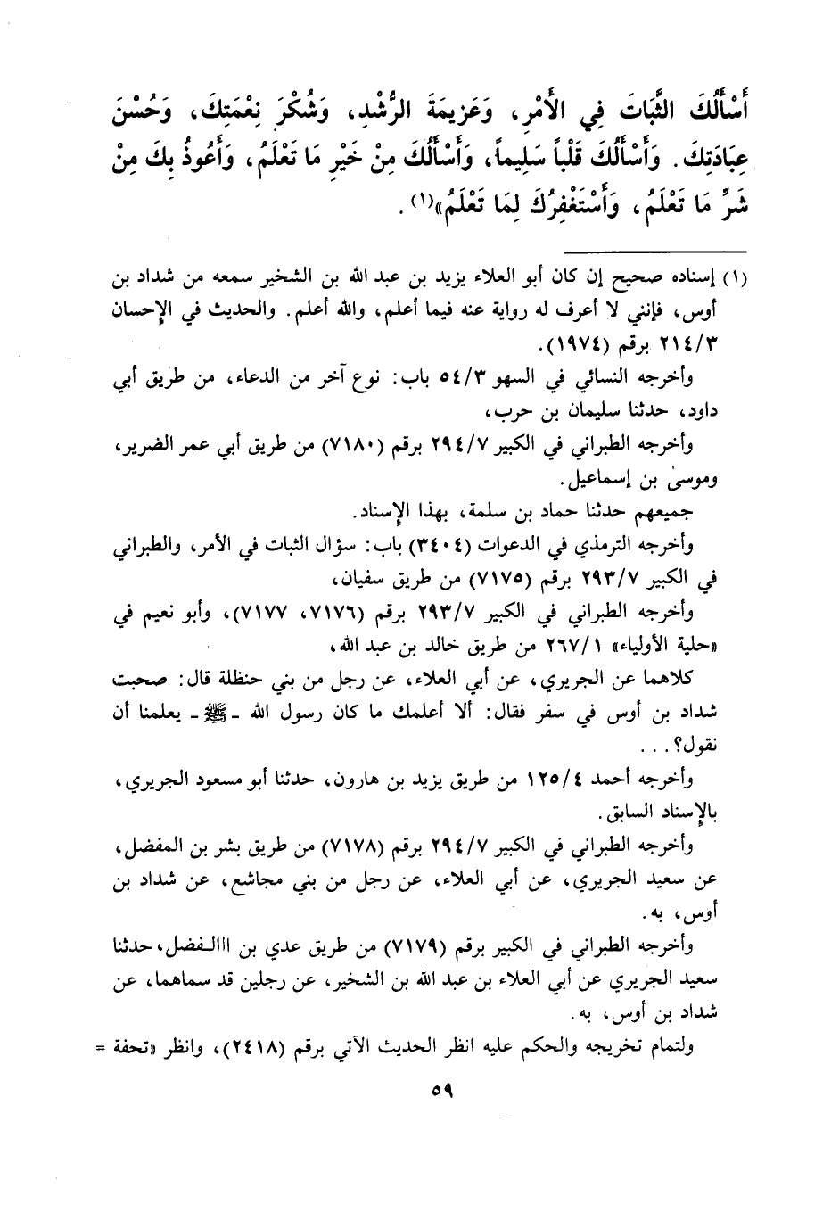 وأخرجه الترمذي في الدعوات (3404) باب: سؤال الثبات في الأمر، والطبراني في الكبير 7/ 293 برقم (7175) من طريق سفيان، وأخرجه الطبراني في الكبير 7/ 293 برقم (7176، 7177)، وأبو نعيم في "حلية الأولياء" 1/ 267 من طريق خالد بن عبد الله، كلاهما عن الجريري، عن أبي العلاء، عن رجل من فى حنظلة قال: صحبت شداد بن أوس في سفر فقال: ألا أعلمك ما كان رَسُول الله -صلى الله عليه وسلم-يعلمنا أن نقول؟ ...