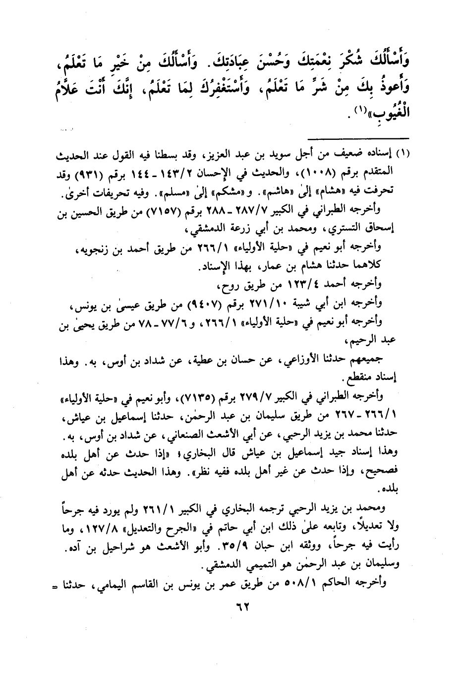 وَأَسْألُكَ شُكْرَ نِعْمَتِكَ وَحُسْنَ عِبَادَتِكَ. وَأَسْألُكَ مِنْ خَيْرِ مَا تَعْلَمُ، وَأَعوذُ بِكَ مِنْ شَرِّ مَا تَعْلَمُ، وَأَسْتَغْفِرُكَ لِمَا تَعْلَمُ، إنَّكَ أنْتَ عَلاَّمُ الْغُيُوبِ" (¬1).