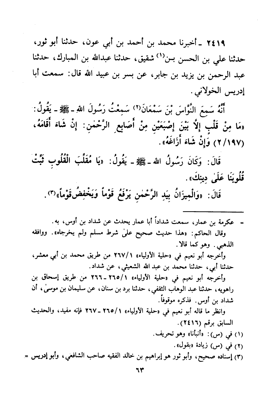 أَنَّهُ سَمعَ النَّوَّاسَ بْنَ سَمْعَانَ (¬2) سَمِعْتُ رَسُولَ اللهِ -صلى الله عليه وسلم- يَقُولُ: "مَا مِنْ قَلْبٍ إلاَّ بَيْنَ إِصْبَعَيْنِ مِنْ أَصَابِعِ الرَّحْمنِ: إِنْ شَاءَ أقَامَهُ، (197/ 2) وَإنْ شَاءَ أزَاغَهُ". قَالَ: وَكَانَ رَسُولُ الله -صلى الله عليه وسلم- يَقُولُ: "يَا مُقّلِّبَ الْقُلُوبِ ثَبِّتْ قُلُوبَنَا عَلَى دِينِكَ". قَالَ: "وَالْمِيزَانُ بِيَدِ الرَّحْمنِ يَرْفَعُ قَوْماً وَيَخْفِضُ قَوْماً" (¬3).
