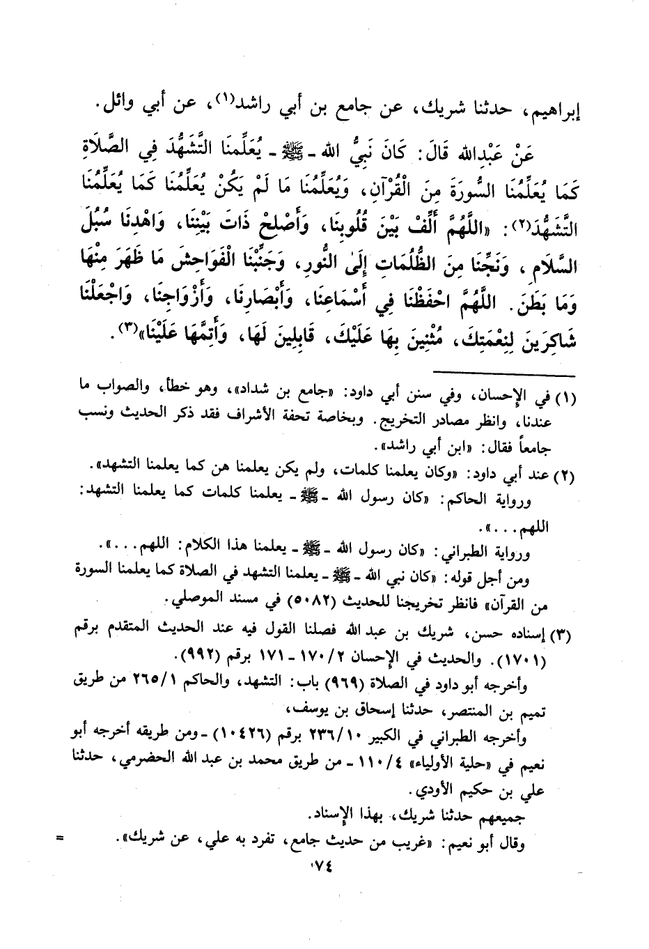 إبراهيم، حدثنا شريك، عن جامع بن أبي راشد (¬1)، عن أبي وائل. عَنْ عَبْدِ الله قَالَ: كَانَ نَبِيُّ الله -صلى الله عليه وسلم- يُعَلِّمنَا التَّشَهُّدَ فِي الصَّلاةِ كَمَا يُعَلِّمُنَا السُّورَةَ مِنَ الْقُرْآنِ، وُيعَلِّمُنَا مَا لَمْ يَكُنْ يُعَلِّمُنَا كَمَا يُعَلِّمُنَا التَّشَهُّدَ (¬2): "اللَّهُمَّ أَلِّفْ بَيْنَ قُلُوبِنَا، وَأَصْلحْ ذَاتَ بَيْنِنَا، وَاهْدِنَا سُبُلَ السَّلام، وَنَجِّنَا مِنَ الظُّلُمَاتِ إِلَى النُّورِ، وَجَنِّبْنَا الْفَوَاحِشَ مَا ظهر مِنْهَا وَمَا بَطَنَ. اللَّهُمَّ احْفَظْنَا فِي أَسْمَاعِنَا، وَأَبْصَارِنَا، وَأَزْوَاجِنَا، وَاجْعَلْنَا شاكرين لِنِعْمَتِكَ، مُثْنِينَ بِهَا عَلَيْكَ، قَابِلِينَ لَهَا، وَأَتِمَّهَا عَلَيْنَا" (¬3).