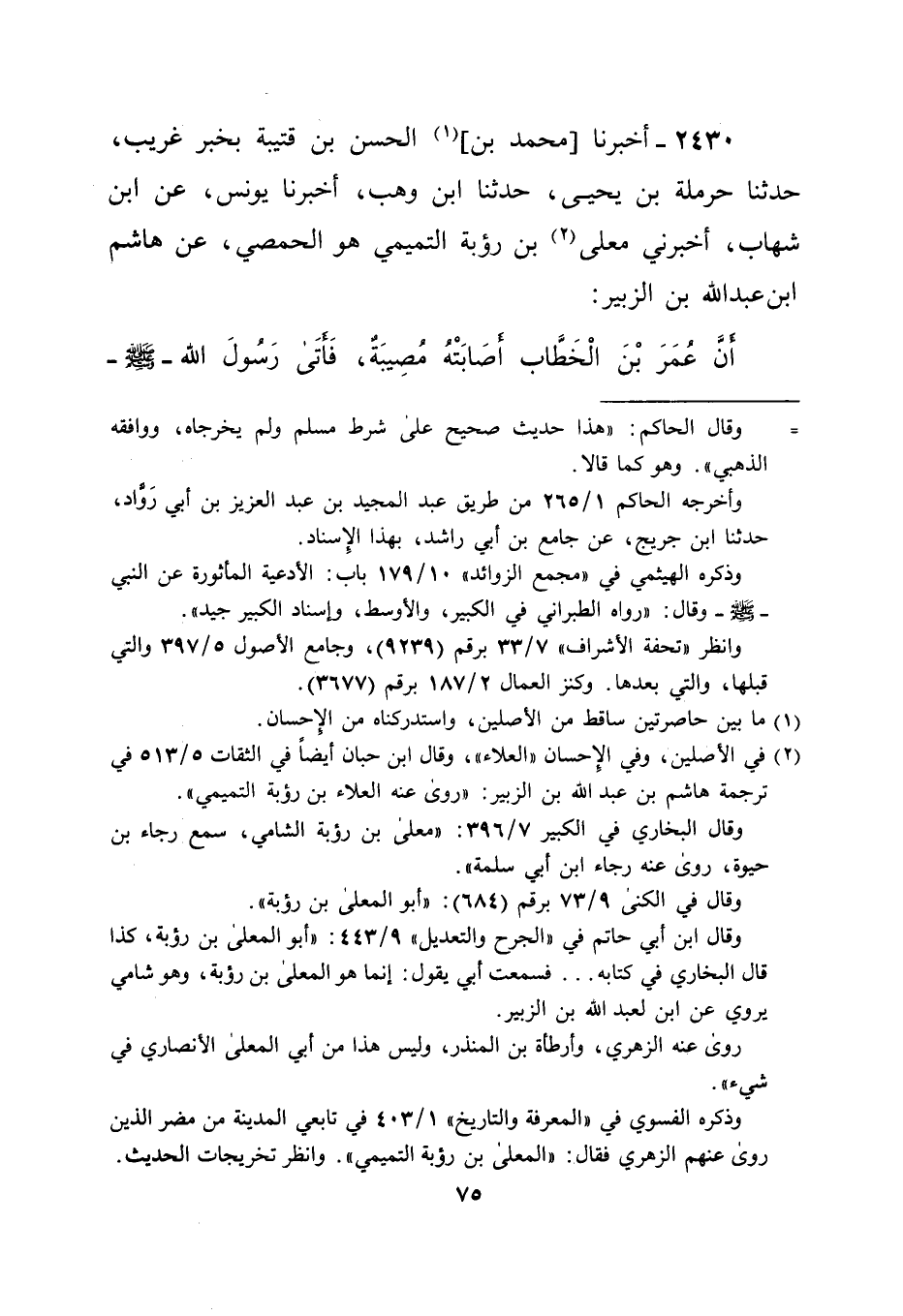 2430 - أخبرنا [محمد بن] (¬1) الحسن بن قتيبة بخبر غريب، حدثنا حرملة بن يحيى، حدثنا ابن وهب، أخبرنا يونس، عن ابن شهاب، أخبرني معلى (¬2) بن رؤبة التميمي هو الحمصي، عن هاشم ابن عبد الله بن الزبير: