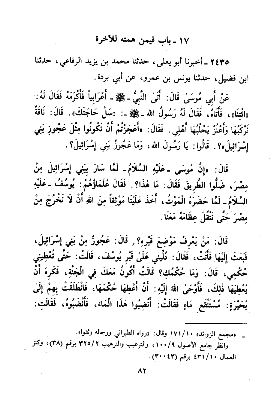 عَنْ أبِي مُوسَى قَالَ: أَتَى النَّبِيّ -صلى الله عليه وسلم- أَعْرَابِياً فَأكْرَمَهُ فَقَالَ لَهُ: "ائْتِنَا"، فَأَتَاهُ، فَقَالَ لَهُ رَسُولُ الله -صلى الله عليه وسلم-: "سَلْ حَاجَتَكَ". قَالَ: نَاقَةٌ نَرْكَبُهَا وَأَعْنُزٌ يَحْلُبُهَا أَهْلِي. فَقَالَ: "أَعَجَزْتُمْ أنْ تَكُونُوا مِثْلَ عَجُوزِ بَنِي إسْرَائِيلَ "؟. قَالُوا: يَا رَسُول الله، وَمَا عَجُوزُ بَنِي إسْرَائيلَ؟. قَالَ: "إِنَّ مُوسَى- عَلَيْهِ السَّلامُ- لما سَارَ بِبَنِي إسْرَائِيلَ مِنْ مِصْرَ، ضَلُّوا الطَّرِيقَ فَقَالَ: مَا هذَا؟. فَقَالَ عُلَمَاؤُهُمْ: يُوسُفُ- عَلَيْهِ السَّلَامُ- لما حَضَرَهُ الْمَوْتُ، أخَذَ عَلَيْنَا مَوْثِقاً مِنَ اللهِ أنْ لا نَخْرُجَ مِنْ مِصْرَ حَتَّى نَنْقُلَ عِظَامَهُ مَعَنَا. قَالَ: مَنْ يَعْرِفُ مَوْضِعَ قَبْرِهِ؟. قَالَ: عَجُوزٌ مِنْ بَنِي إسْرَائِيلَ، فَبَعَثَ إلَيْهَا فَأتَتْ، فَقَالَ: دُلِّيني عَلَى قَبْرِ يُوسُفَ، قَالَتْ: حَتى تُعْطِينِي حُكْمِي، قَالَ: وَمَا حُكْمُكِ؟ قَالَتْ أكُونُ مَعَكَ فِي الْجَنَّةِ، فَكَرِهَ أنْ يُعْطِيَهَا ذلِكَ، فَأوْحَى اللهُ إِلَيْهِ: أنْ أَعْطِهَا حُكْمَهَا، فَانْطَلَقَتْ بِهِمْ إلَى بُحَيْرَةٍ: مُسْتَنْقَعِ مَاءٍ فَقَالَتْ: أَنْضِبُوا هذَا الْمَاءَ، فَأَنْضَبُوهُ، فَقَالَتِ: