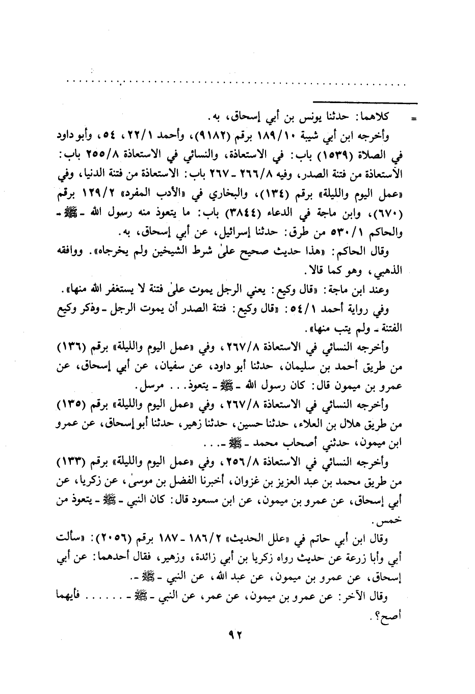 وقال ابن أبي حاتم في "علل الحديث" 2/ 186 - 187 برقم (2056): "سألت أبي وأبا زرعة عن حديث رواه زكريا بن أبي زائدة، وزهير، فقال أحدهما: عن أبي إسحاق، عن عمرو بن ميمون، عن عبد الله، عن النبي-صلى الله عليه وسلم -.