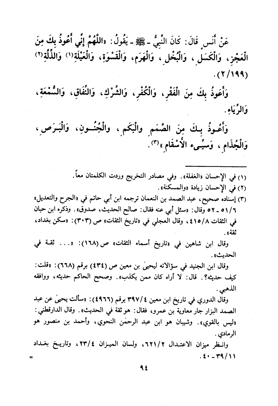 عَنْ أَنَس قَالَ: كَانَ النَّبِيُّ -صلى الله عليه وسلم- يَقُولُ: "اللَّهُمَّ إنِّي أعُوذُ بِكَ مِنَ الْعَجْزِ، وَالْكَسَلِ، وَالْبُخْلِ، وَالْهَرَم، وَالْقَسْوَةِ، وَالْعَيْلَةِ (¬1) وَالذِّلَّةِ (¬2) (199/ 2). وَأعَوذُ بِكَ مِنَ الْفَقْرِ، وَالْكُفْرِ، وَالشِّرْكِ، وَالنِّفَاقِ، والسُّمْعَةِ، وَالرِّيَاءِ. وَأَعُوذُ بكَ مِنَ الصَّمَم والْبَكَمِ، والْجُنُونِ، وَالْبَرَصِ، وَالْجُذَامِ، وسيِّىء الأَسْقَامِ" (¬3).