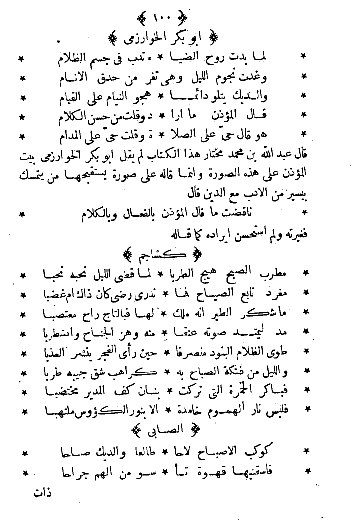 قال عبد الله بن محمد مختار هذا الكتاب لم يقل أبو بكر الخوارزمي بيت المؤذن على هذه الصورة وإنما قاله على صورة يستقبحها من يتمسك بيسير من الأدب مع الدين قال: