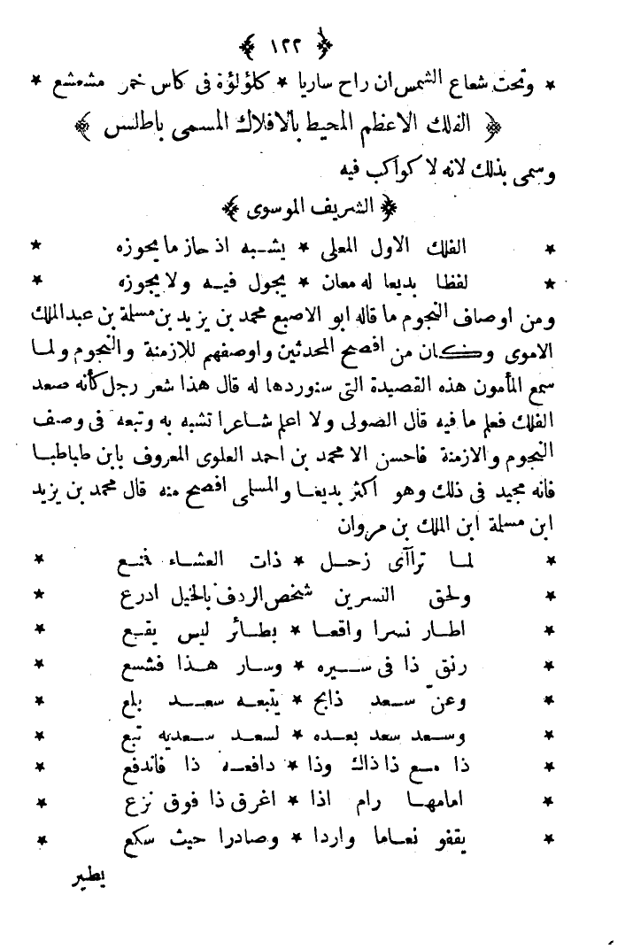 ومن أوصاف النجوم ما قاله أبو الإصبع محمد بن يزيد بن مسلمة بن عبد الملك الأموي وكان من أفصح المحدثين وأوصفهم للأزمنة والنجوم. ولما سمع المأمون هذه القصيدة التي سنوردها له قال: هذا شعر رجل كأنه صعد الفلك فعلم ما فيه. قال الصولي: ولا أعلم شاعراً تشبه به وتبعه في وصف النجوم والأزمنة فأحسن إلا محمد العلوي المعروف بابن طباطبا فأنه مجيد في ذلك وهو أكثر بديعاً والمسلمي أفصح منه. قال محمد بن يزيد بن مسلمة بن عبد الملك بن مروان:
