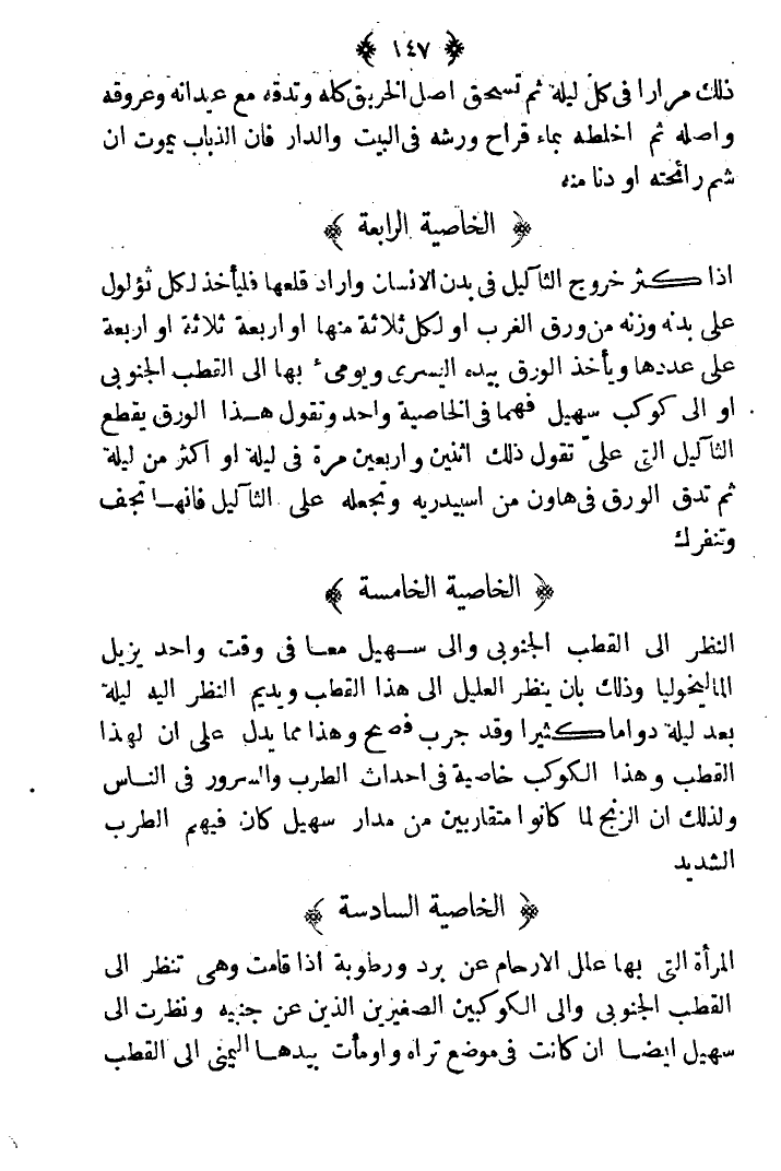النظر إلى القطب الجنوبي وإلى سهيل معا في وقت واحد يزيل الماليخوليا وذلك بأن ينظر العليل إلى هذا القطب ويديم النظر إليه ليلة بعد ليلة دواما كثيرا وقد جرب فصح وهذا مما يدل على أن لهذا القطب وهذا الكوكب خاصية في أحداث الطرب والسرور في الناس ولذلك أن الزنج لما كانوا متقاربين من مدار سهيل كان فيهم الطرب الشديد.