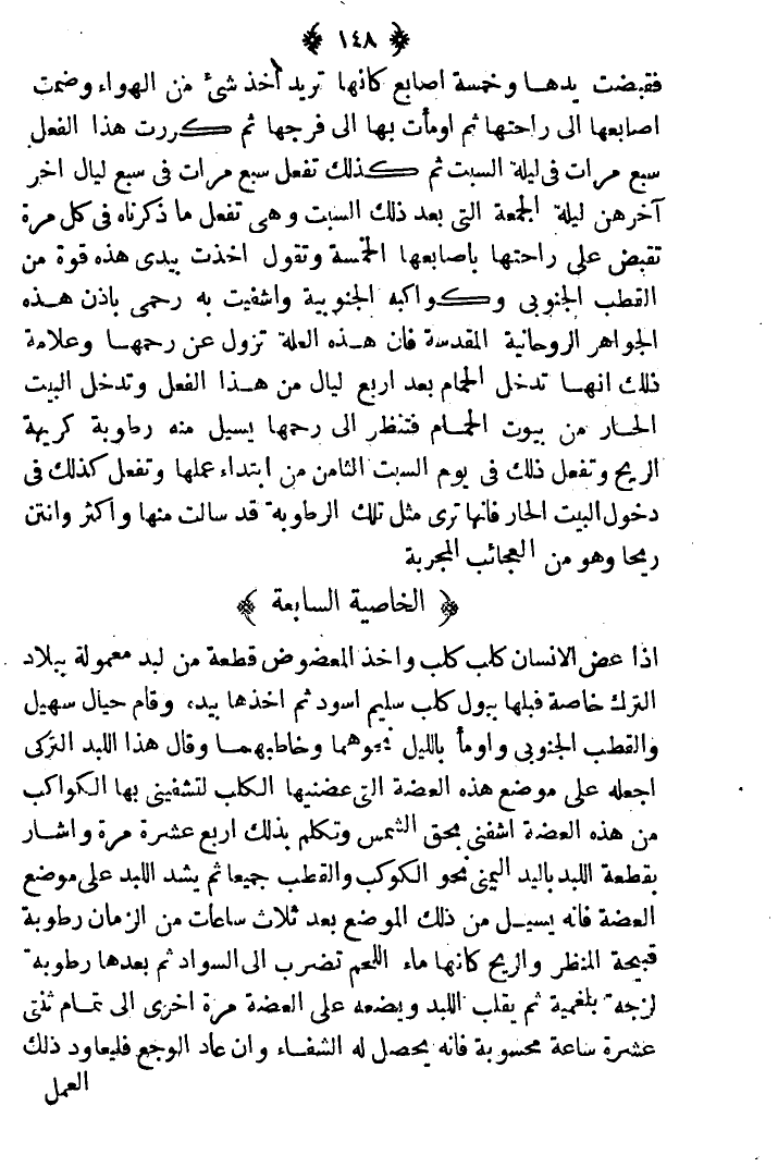 إذا عض الإنسان كلب كلب وأخذ المعضوض قطعة من لبد معمولة ببلاد الترك خاصة فبلها ببول كلب أسود ثم أخذها بيده وقام حيال سهيل والقطب الجنوبي وأومأ بالليل نحوهما وخاطبها وقال: هذا اللبد التركي أجعله على موضع هذه العضة التي عضنيها الكلب لتشفيني بها الكواكب من هذه العضة اشفني بحق الشمس. وتكلم بذلك أربع عشرة مرة وأشار بقطعة اللبد باليد اليمنى نحو الكوكب والقطب جميعاً ثم يشد اللبد على موضع العضة فإنه يسيل من ذلك الموضع بعد ثلاث ساعات من الزمان رطوبة قبيحة المنظر والريح كأنها ماء اللحم تضرب إلى السواد ثم بعدها رطوبة لزجة بلغمية ثم يقلب اللبد ويضعه على العضة مرة أخرى إلى تمام اثنتي عشرة ساعة محسوبة فإنه يحصل له الشفاء وأن عاد الوجع فليعاود ذلك