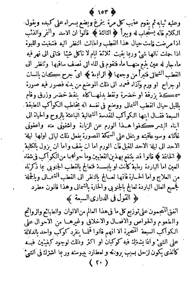 وعليه ثيابه، ثم يقوم عقيب كل مرة يتمرغ ويضع يسراه على كبده ويقول الكلام فإنه يستجاب له ويبرأ (الثالثة) قالوا أن الأسد والنمر والذئب إذا مرضت قامت حيال هذا القطب وأطالت النظر إليه فشفيت، واللبوة إذا حملت نالها شيء وربما بقيت ثلاثة أيام لا تأكل شيئاً فتأتي إلى نهر فيه ماء جار له عين ينبع منها ماء فتقوم في الماء إلى نصف ساقيها وتنظر إلى القطب الشمالي فتبرأ من وجعها (الرابعة) أي جرح كان بإنسان أو جراح أو ورم وآذاه فعمد إلى ذلك الموضع من بدنه فصور فيه صورة سمكة بزرقة أو خضرة ونقط بدنها كله بنقط خضر وزرق، وقام بالليل حيال القطب الشمالي ووضع في نفسه أنه يخاطب الكواكب المطبقة السبعة فقال: أيتها الكواكب المقدسة الشمالية الباعثة بالروح والحياة إلى أبناء البشر كفوا هذا الورم عن الزيادة وأشفوني منه وأعفوني غائلته وسوء عاقبته. ويتفل على السمكة المصورة يفعل ذلك ليالي أولها ليلة الأحد إلى ليلة الأحد