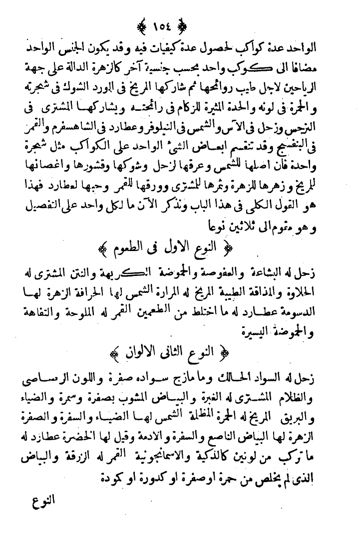 الواحد عدة كواكب لحصول عدة كيفيات فيه، وقد يكون الجنس الواحد مضافا إلى كوكب واحد بحسب جنسية آخر كالزهرة الدالة على جهة الرياحين لأجل طيب روائحها ثم شاركها المريخ في الورد الشوك في شجرته والحمرة في لونه والحدة المثيرة للزكام في رائحته ويشاركها المشتري في النرجس وزحل في الآس والشمس في النيلوفر وعطارد في الشاهسفرم والقمر في البنفسج، وقد تنقسم أبعاض الشيء الواحد على الكواكب مثل شجرة واحدة فإن أصلها للشمس وعرقها لزحل وشوكها وقشورها وأغصانها للمريخ وزهرها للزهرة وثمرها للمشتري وورقها للقمر وحبها لعطارد، فهذا هو القول الكلي في هذا الباب ونذكر الآن ما لكل واحد على التفصيل وهو مقوم إلى ثلاثين نوعا.