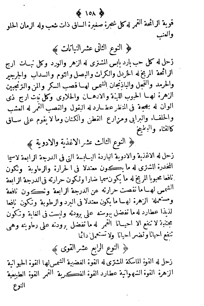 زحل له الأغذية والأدوية الباردة اليابسة التي في الدرجة الرابعة لاسيما المخدرة. المشتري له ما يكون معتدلا في الحرارة والرطوبة ويكون نافعا محبوباً. المريخ له ما يكون سميا ضاراً وتكون حرارته في الدرجة الرابعة. الشمس لها ما نقصت حرارته عن الدرجة الرابعة وتكون نافعة ومستعملة. الزهرة لها ما يكون معتدلا في البرد والرطوبة ويكون نافعاً لذيذا. عطارد له ما تفضل يبوسته على برودته وليست في الغابة وتكون مجتنبة لا تنفع ألا أحيانا. القمر له ما تفضل برودته على رطوبته وهي تنفع أحيانا ولا تستعمل دائماً.