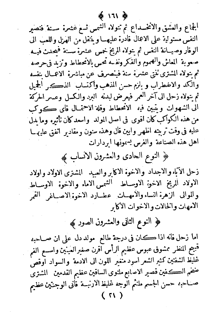 الجماع والعشق والانخداع، ثم تتولاه الشمس تسع عشرة سنة فتصير النفس مستولية على الأعمال قادرة عليها وينتقل من الهزل واللعب إلى الوقار وصيانة النفس، ثم يتولاه المريخ خمس عشرة سنة فيحدث فيه صعوبة المعاش والهموم والفكر ونفسه تحس بالانحطاط وتزيد في حرصه، ثم يتولاه المشتري اثنتي عشرة سنة فينصرف عن مباشرة الأعمال بنفسه والكد والاضطراب ويلزم حسن المذهب واكتساب الذكر الجميل، ثم يتولاه زحل إلى آخر العمر فيعرض لبدنه البرد والكسل وعسر الحركة إلى الشهوات ويتبين فيه الانحطاط وقلة الاحتمال فأي كوكب من هذه الكواكب كان أقوى في أصل المولد وأسعد كان تأثيره وما يدل عليه في وقت تربيته أظهر وأبين قال وهذه سنون