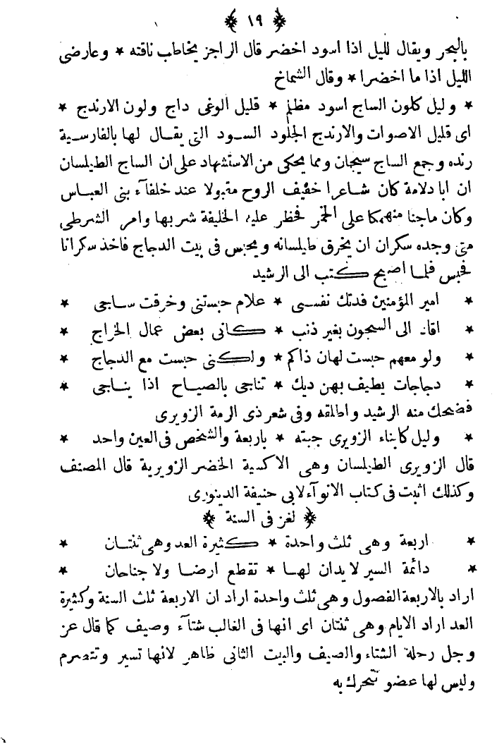 أي قليل الأصوات والأندج الجلود السود التي يقال لها بالفارسية رنده وجمع الساج سيجان ومما يحكى من الاستشهاد على أن الساج الطيلسان أن أبا دلامة كان شاعرا خفيف الروح مقبولا عند خلفاء بني العباس، وكان ماجنا منهمكا على الخمر فحظر عليه الخليفة شربها وأمر الشرطي متى وجده سكرانا أن يخرق طيلسانه ويحبس في بيت الدجاج، فأخذ سكرانا فحبس فلما أصبح كتب إلى الرشيد.