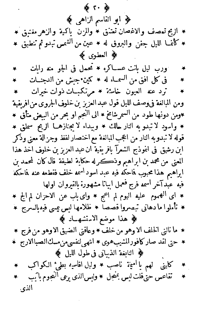 قوله لا تبدو به النار من أعجب المبالغة مع اختصار لفظ وجزالة معنى وذكر ابن رشيق في نموذج الشعراء بإفريقية أن عبد العزيز بن خلوف أحد هذا المعنى من محمد بن إبراهيم وذكر له حكاية لطيفة قال: كان محمد بن إبراهيم هذا محبوب فماحكه فيه أسود أسمه خلف فقطعه عنه، فماحكه فيه عبد آخر اسمه فرج فعمل أبياتا مشهورة بالقيروان أولها: