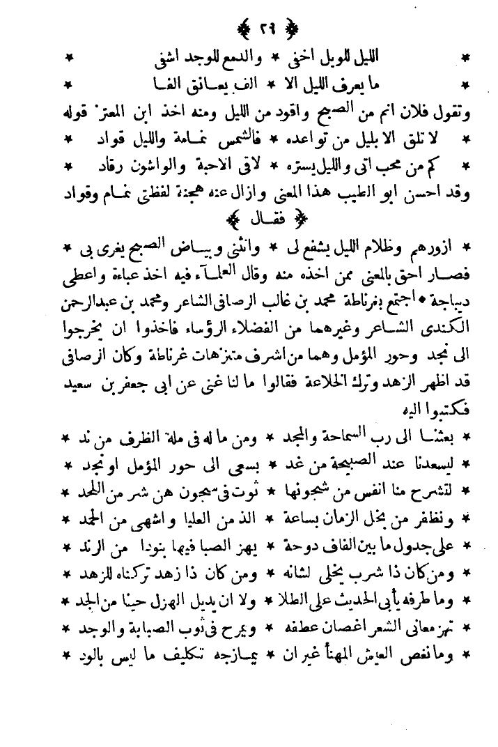 فصار أحق بالمعنى ممن أخذه منه وقال العلماء فيه أخذ عباءه وأعطى ديباجة اجتمع بغرناطة محمد بن غالب الرصافي الشاعر ومحمد بن عبد الرحمن الكندي الشاعر وغيرهما من الفضلاء الرؤساء فأخذوا أن يخرجوا إلى نجد وحور المؤمل وهما من أشرف متنزهات غرناطة وكان الرصافي قد أظهر الزهد وترك الخلاعة فقالوا: ما لنا غنى عن أبي جعفر بن سعيد، فكتبوا إليه: