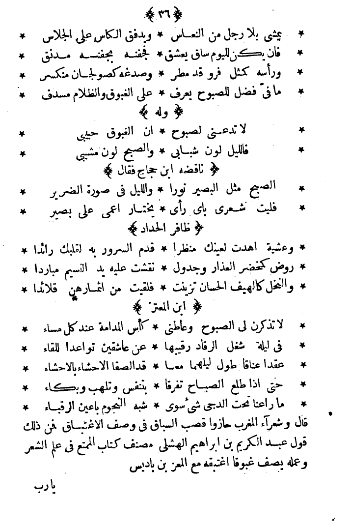 قال وشعراء المغرب حازوا قصب السباق في وصف الاغتباق فمن ذلك قول عبد الكريم بن إبراهيم الهشلي مصنف كتاب الممتع في علم الشعر وعمله يصف غبوقا اغتبقه مع المعز بن باديس: