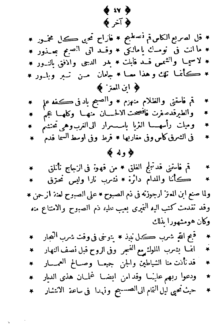 ولما ابن المعتز أرجوزته في ذم الصبوح، على الصبوح لعبة الرحمن، وقد تقدمت كتب إليه النميري يعيب عليه ذم الصبوح والامتناع منه وكان هو مشهورا بذلك: