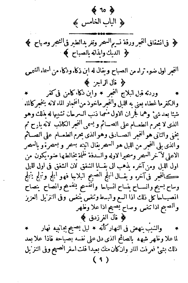 والكفر ما غطاه يعني به الليل والفجر مأخوذ من انفجار الماء لأنه ينفجر كالماء شيئا بعد شيء وهما فجران الأول منهما ذنب السرحان تشبيها له بذلك وهو الذي لا يحرم الطعام على الصائم ويسمى الفجر الكاذب لأنه يلوح ثم يخفى والثاني هو الفجر الصادق وهو الذي يحرم الطعام على الصائم والذي يلي الفجر من الليل هو السحر يقال أتيته بسحر وبسحرة وبالسحر الأعلى لآخر السحر وسحيرا لأوله والسدفة ظلمة يخالطها ضوء يكون من أول الليل ومن آخره يذهب إلى بقايا الشفق لأن الشفق في أول الليل كالفجر في آخره ويقال انبلج الصبح انبلاجا فهو أبلج وتبلج يتبلج وساح يسيح وانساح ينساح أنسياحا وانفسح ينفسح وانصاح ينصاح أنصياحا كل ذلك إذا اتسع وانبسط وتنفس يتنفس وفي التنزيل العزيز (والصبح إذا تنفس) وصاح يصيح إذا علا وظهر.