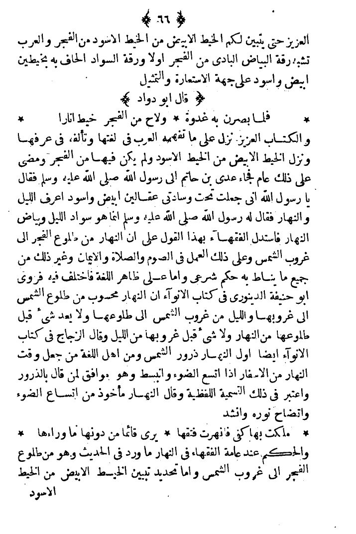 الأبيض من الخيط الأسود ولم يكن فيها من الفجر ومضى على ذلك عام فجاء عدي بن حاتم إلى رسول الله صلى الله عليه وسلم فقال: يا رسول الله إني جعلت تحت وسادتي عقالين أبيض وأسود أعرف الليل والنهار. فقال له رسول الله إني جعلت تحت وسادتي عقالين أبيض وأسود أعرف الليل والنهار. فقال له رسول الله صلى الله عليه وسلم: إنما هو سواد الليل وبياض النهار، فأستدل بهذا القول على أن النهار من طلوع الفجر إلى غروب الشمس وعلى ذلك العمل في الصوم والصلاة والإيمان وغير ذلك من جميع ما يناط به حكم شرعي، وأما على ظاهر اللغة فاختلف فيه فروى أبو حنيفة الدينوري في كتاب الأنواء أن النهار محسوب من طلوع الشمس إلى غروبها والليل من غروب الشمس حتى طلوعها ولا يعد شيء قبل طلوعها من النهار ولا شيء قبل غروبها من الليل، وقال الزجاج في كتاب الأنواء أيضا: أول النهار ذرور الشمس، ومن أهل اللغة من جعل وقت النهار من الأسفار إذا أتسع الضوء وانبسط وهو موافق لمن قال بالذرور واعتبر في ذلك التسمية اللفظية وقال النهار مأخوذ من أتساع الضوء واتضاح نوره وانشد: