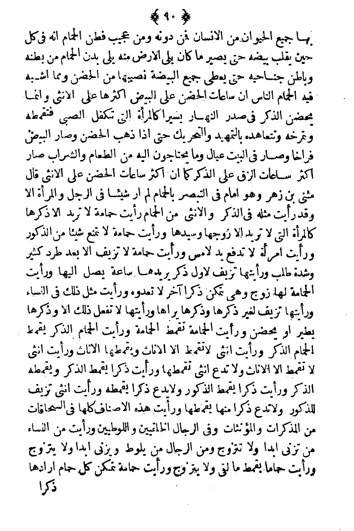 بها الحيوان من الإنسان فمن دمنه ومن عجيب فطن الحمام أنه في كل حين يقلب بيضه حتى يصير ما كان يلي الأرض منه يلي بدن الحمام من بطنه وباطن جناحيه حتى يعطي جميع البيض نصيبها من الحضن ومما أشبه فيه الحمام الناس أن ساعات الحضن على البيض أكثرها على الأنثى وإنما يحضن الذكر في صدر النهار يسيرا كالمرأة التي تكفل الصبي فتطعمه وتمرخه وتتعاهد بالتمهيد والتحريك حتى إذا ذهب الحضن وصار البيض فراخا وصار في البيت عيال وما يحتاجون إليه من الطعام والشراب صار أكثر ساعات الزق على الذكر كما أن أكثر ساعات الحضن على الأنثى. قال مثنى بن زهر وهو أمام في التبصر بالحمام لم أر شيئا في الرجل والمرأة إلا رأيت مثله في الذكر والأنثى من الحمام رأيت حمامة لا تريد إلا ذكرها كالمرأة التي لا تريد إلا زوجها وسيدها ورأيت حمامة لا تمنه شيئا من الذكور ورأيت امرأة لا تدفع يد لامس ورأيت حمامة لا تزيف إلا بعد طرد كثير وشدة طلب ورأيتها تزيف لأول ذكر يريدها ساعة يصل إليها، ورأيت الحمامة لها زوج وهي تمكن ذكرا آخر لا تعدوه ورأيت مثل ذلك في النساء، ورأيتها تزيف لغير ذكرها وذكرها يراها ورأيتها لا تفعل ذلك إلا وذكرها يطير أو يحضن، ورأيت الحمامة تقمط الحمامة ورأيت الحمام الذكر يقمط الحمام الذكر، ورأيت أنثى لا تقمط إلا الإناث ويقمطها افناث ورأيت أنثى لا تقمط إلا الإناث ولا تدع أنثى تقمطها، ورأيت ذكرا يقمط الذكر ويقمطه الذكر ورأيت ذكرا يقمط الذكور ولا يدع ذكرا يقمطه، ورأيت أنثى تزيف للذكور ولا تدع ذكرا منها يقمطها، ورأيت هذه الأصناف كلها في السحاقات من المذكرات والمؤنثات وفي الرجال الخلقيين واللوطيين ورأيت من النساء من تزني أبدا ولا تتزوج ومن الرجال من يلوط ولا يزني أبدا ولا يتزوج ورأيت حماما يقمط ما لقي ولا