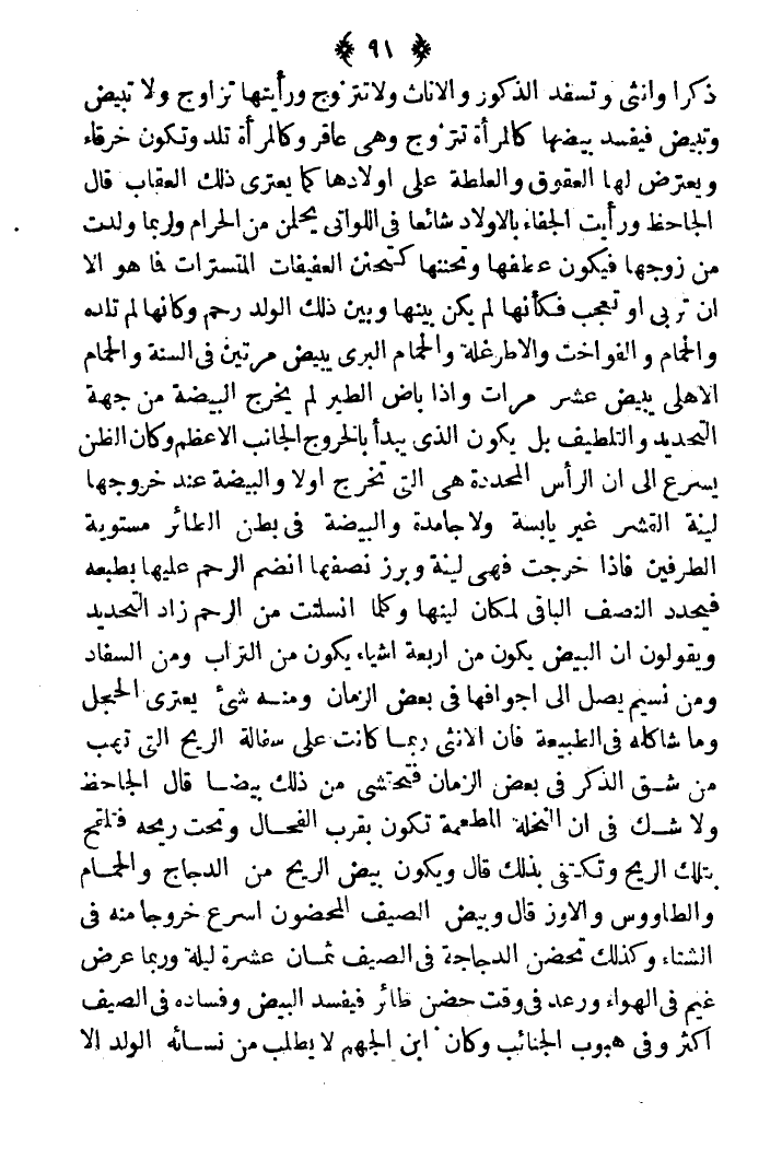 ذكرا وأنثى وتسفد الذكور والإناث ولا تتزوج ورأيتها تزاوج ولا تبيض وتبيض فيفسد بيضها كالمرأة وهي عاقر وكالمرأة تلد وتكون خرقاء ويعترض لها العقوق والطلة على أولادها كما يعتري ذلك العقاب قال الجاحظ: ورأيت الجفاء بالأولاد شائعا في اللواتي يحملن من الحرام ولربما ولدت من زوجها فيكون عطفها وتحنتها وبين ذلك الولد رحم وكأنها لم تلده، والحمام والفواخت والأطرغلة والحمام البري يبيض مرتين في السنة والحمام الأهلي يبيض عشر مرات وإذا باض الطير لم يخرج البيضة من جهة التحديد والتلطيف لبل يكون الذي يبدأ بالخروج الجانب الأعظم وكان الظن يسرع على أن الراس المحددة هي التي تخرج أولا والبيضة عند خروجها لينة القشرة غير يابسة ولا جامدة والبيضة في بطن الطائر مستوية الطرفين فإذا خرجت فهي لينة وبرز نصفها أنضم الرحم عليها بطبعه فيحدد النصف الباقي لمكان لينها وكلما انسلتت منم الرحم زاد التحديد ويقولون أن البيض يكون من أربعة أشياء يكون من التراب ومن السماد ومن نسيم يصل إلى أجوافها في بعض الزمان ومنه شيء يعتري الحجل وما شاكله في الطبيعة فإن الأنثى ربما كانت على سفالة الريح التي تهب من شق الذكر في بعض الزمان فتحتشي من ذلك بيضا قال الجاحظ ولا شك في أن النخلة المطعمة تكون بقرب الفحال وتحت ريحه فتلقح بتلك الريح وتكتفي بذلك قال ويكون بيض الريح من الدجاج والحمام والطاووس والإوز قال وبيض الصيف المضون أسرع خروجا منه من الشتاء وكذلك تحضن الدجاجة في الصيف ثمان عشرة ليلة وربما عرض غيم في الهواء ورعد في وقت حضن طائر فيفسد البيض وفساده في الصيف أكثر وفي هبوب الجنائب وكان ابن الجهم لا يطلب من نسائه الولد إلا