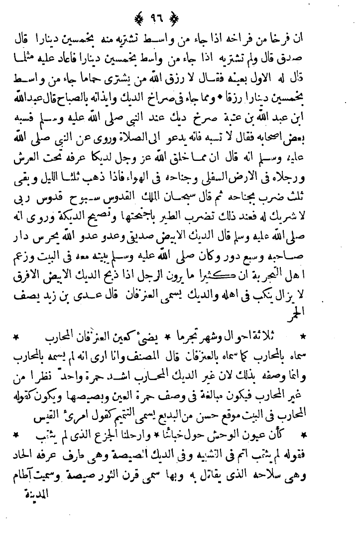 ومما جاء في صراخ الديك وآذانه بالصباح قال عبد الله بن عبد الله بن عتبة: صرخ ديك عند النبي صلى الله عليه وسلم فسبه بعض أصحابه فقال (لا تسبوه فأنه يدعو إلى الصلاة) وروى عن النبي صلى الله عليه وسلم أنه قال: (إن مما خلق الله عز وجل لديكا عرفه