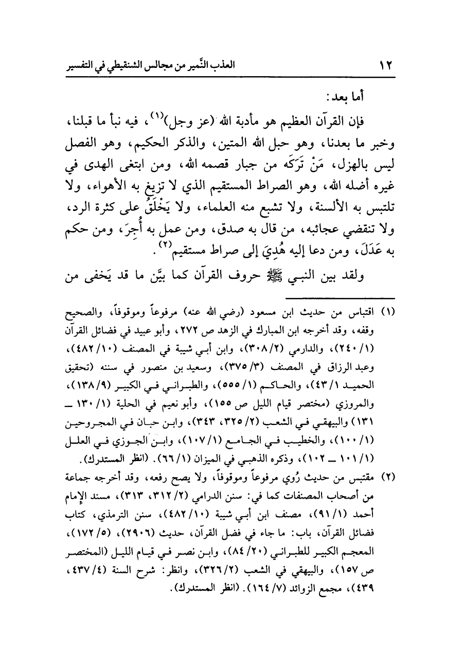 (¬١) اقتباس من أثر عن ابن مسعود رضي الله عنه: أخرجه ابن المبارك في الزهد ص ٢٧٢، وعبد الرزاق في المصنف (٥٩٩٨، ٦٠١٧)، (٣/ ٣٦٨، ٣٧٥)، وسعيد بن منصور (التفسير)، (٧)، (١/ ٤٣)، والدارمي (٣٣١٠، ٣٣١٨)، (٢/ ٣٠٨، ٣١٠)، وابن نصر في قيام الليل (المختصر ص ١٧٣)، والفريابي في فضائل القرآن (٤١، ٥٩)، ص ١٥٢، ١٦٦، والطبراني في الكبير (٩/ ١٣٨)، وأبو نعيم في الحلية (١/ ١٣٠ - ١٣١)، وتاريخ أصبهان (٢/ ٢٤٢)، والرازي في فضائل القرآن (٣١)، ص ٧٤، والبيهقي في السنن الصغير (٩٤٤)، (١/ ٣٣٣)،والشعب (١٧٨٦، ١٨٣٢)، (٤/ ٤٩٣، ٥٤٩)، وابن منده في الرد على من يقول (آلم) حرف (٩)، ص ٤٨، والشجري في الأمالي (ترتيب الأمالي)، (٤٤٧، ٥٧٦)، (١/ ١١٦، ١٥٥)،والبغوي في التفسير (١/ ٣٢). موقوفاً.