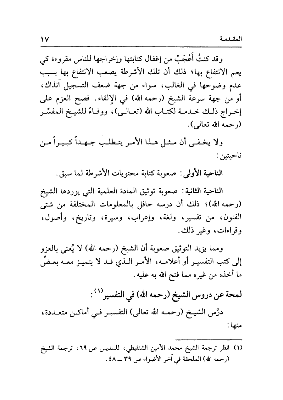 (¬١) انظر: ترجمة الشيخ محمد الأمين الشنقيطي، للسديس ص ٦٩، ترجمة الشيخ (رحمه الله) الملحقة في آخر الأضواء ص ٣٩ - ٤٨.