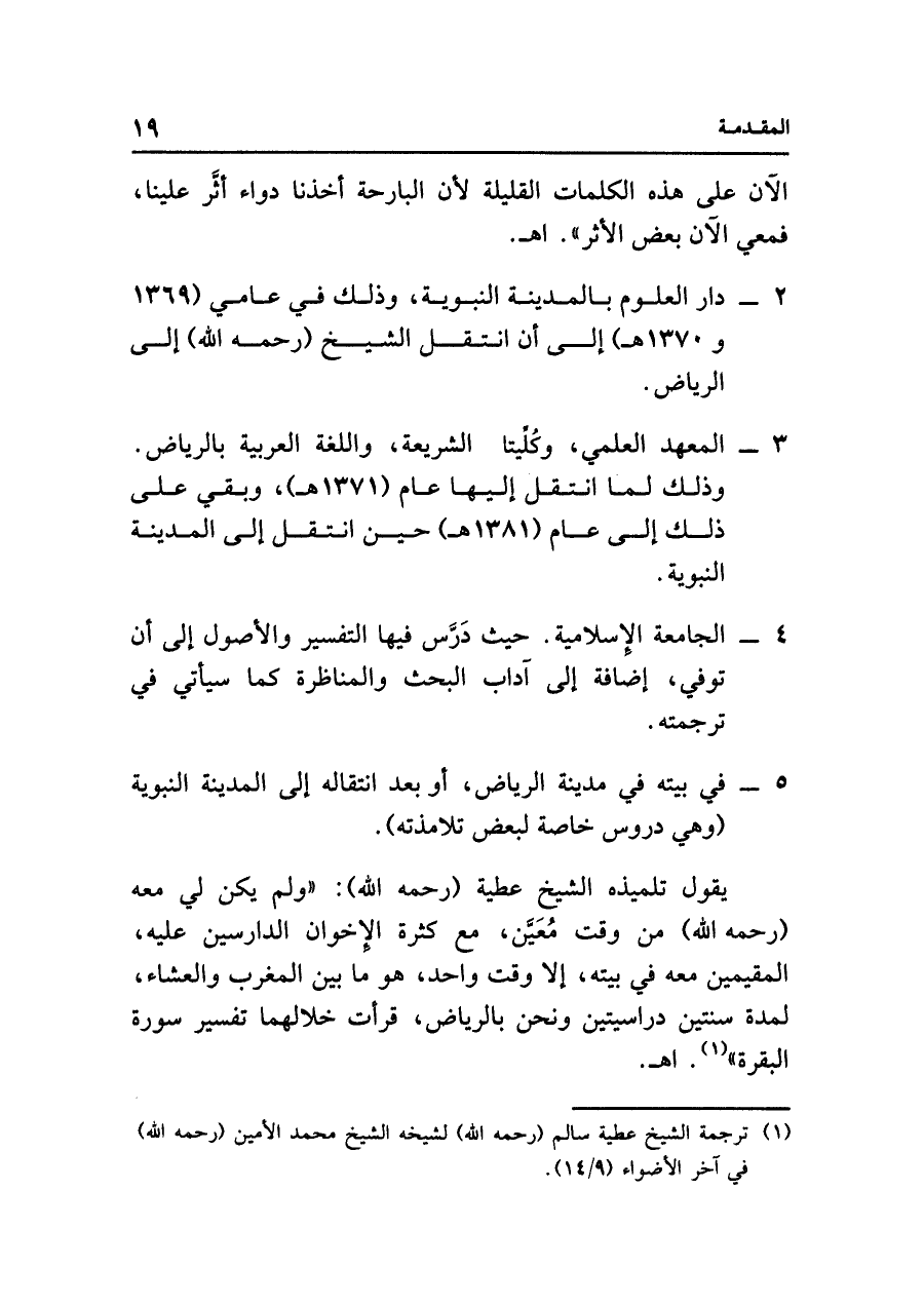 (¬١) ترجمة الشيخ عطية سالم (رحمه الله) لشيخه الشيخ محمد الأمين (رحمه الله) في آخر الأضواء (٩/ ١٤).