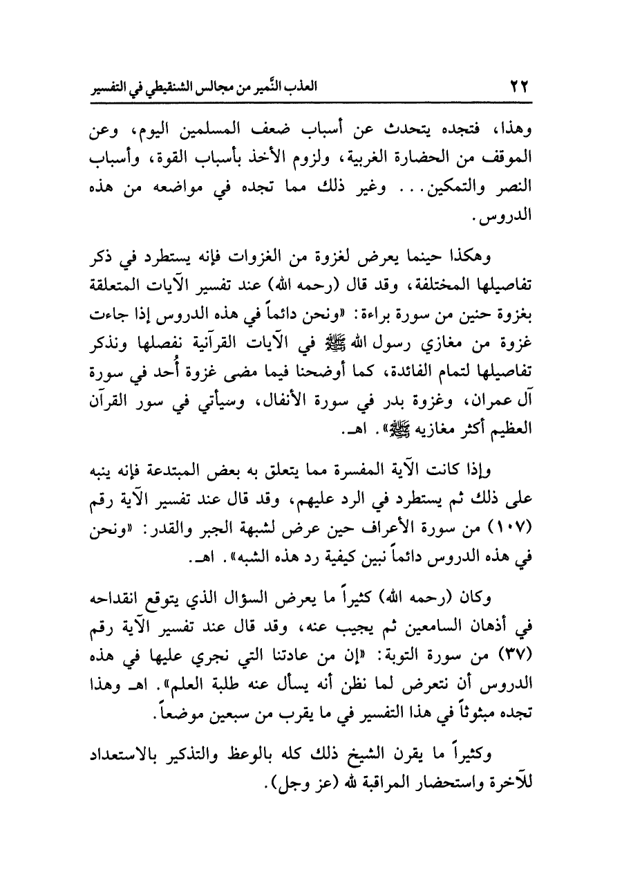 وهكذا حِينَمَا يعرضُ لغزوةٍ من الغزواتِ فإنه يَسْتَطْرِدُ في ذِكْرِ تفاصيلِها المختلفةِ، وقد قال (رحمه الله) عندَ تفسيرِ الآياتِ المتعلقةِ بغزوةِ حُنَيْنٍ من سورةِ بَرَاءَةٍ: «ونحنُ دائمًا في هذه الدروسِ إذا جاءت غزوةٌ من مَغَازِي رسولِ اللَّهِ - صلى الله عليه وسلم - في الآياتِ القرآنيةِ نُفَصِّلُهَا ونذكرُ تفاصيلَها لتمامِ الفائدةِ، كما أَوْضَحْنَا فيما مَضَى غزوةَ أُحُدٍ في سورةِ آلِ عمرانَ، وغزوةِ بَدْرٍ في سورةِ الأنفالِ، وسيأتي في سورِ القرآنِ العظيمِ أكثرُ مَغَازِيهِ - صلى الله عليه وسلم -» اهـ.