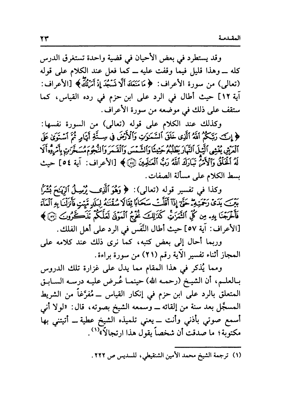 وقد يَسْتَطْرِدُ في بعضِ الأحيانِ في قضيةٍ واحدةٍ تستغرقُ الدرسَ كُلَّهُ - وهذا قليلٌ فيما وَقَفْتُ عليه - كما فَعَلَ عند الكلامِ على قولِه (تعالى) من سورةِ الأعرافِ: {مَا مَنَعَكَ أَلَاّ تَسْجُدَ إِذْ أَمَرْتُكَ} [الأعراف: آية ١٢] حيث أَطَالَ في الردِّ على ابنِ حَزْمٍ في رَدِّهِ القياسَ، كما سَتَقِفُ على ذلك في موضعِه من سورةِ الأعرافِ.