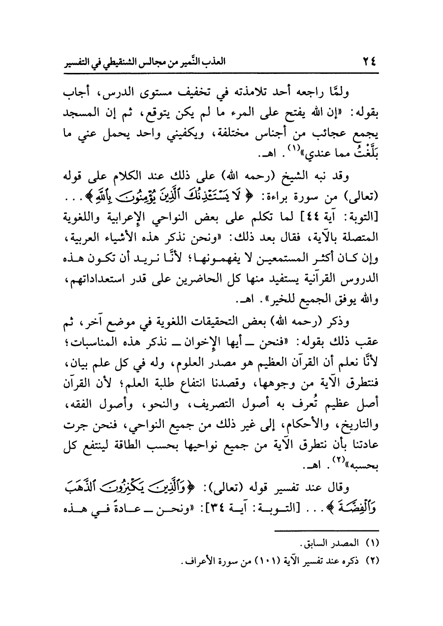 وقد نَبَّهَ الشيخُ (رحمه الله) على ذلك عند الكلامِ على قولِه (تعالى) من سورة براءة: {لَا يَسْتَأْذِنُكَ الَّذِينَ يُؤْمِنُونَ بِاللَّهِ ... } [التوبة: آية ٤٤] لَمَّا تكلمَ على بعضِ النواحِي الإعرابيةِ واللغويةِ المتصلةِ بالآيةِ، فقال بعدَ ذلك: «ونحنُ نذكرُ هذه الأشياءَ العربيةَ، وإن كانَ أكثرُ المستمعين لا يَفْهَمُونَهَا؛ لأَنَّا نريدُ أن تكونَ هذه الدروسُ القرآنيةُ يستفيدُ منها كُلُّ الحاضرين على قَدْرِ استعداداتِهم، وَاللَّهُ يُوَفِّقُ الجميعَ للخيرِ» اهـ.