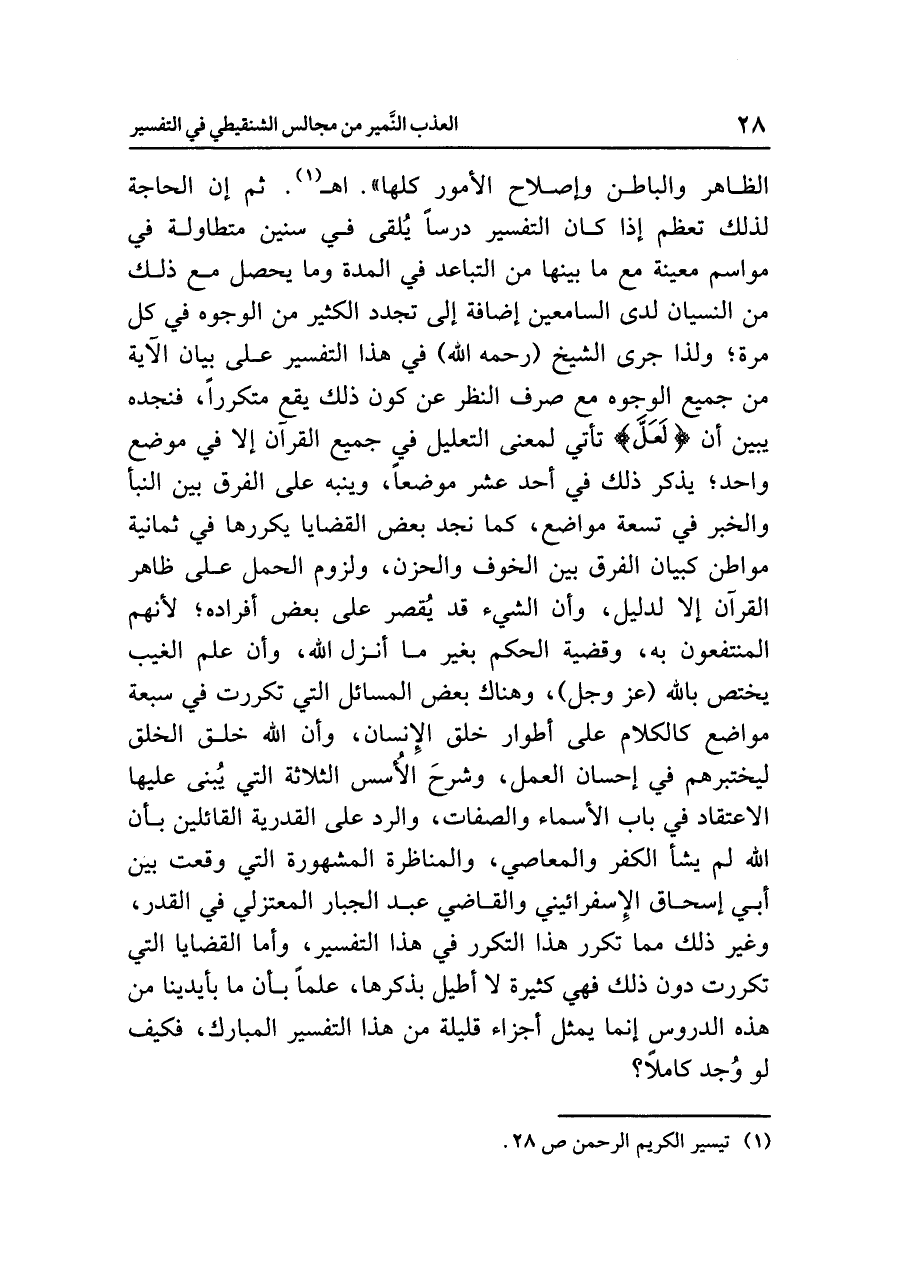 ثم إن الْحَاجَةَ لذلك تَعْظُمُ إذا كان التفسيرُ دَرْسًا يُلْقَى في سنين متطاولةٍ في مواسمَ معينةٍ مع ما بَيْنَهَا من التباعدِ في المدةِ وما يحصلُ مع ذلك من النسيانِ لَدَى السامعين؛ إضافةً إلى تَجَدُّدِ الكثيرِ من الوجوهِ في كُلِّ مَرَّةٍ؛ ولذا جَرَى الشيخُ (رحمه الله) في هذا التفسيرِ على بيانِ الآيةِ من جميعِ الوجوهِ مع صَرْفِ النظرِ عن كَوْنِ ذلك يقعُ مُتَكَرِّرًا، فنجدُه يُبَيِّنُ أَنَّ: {لَعَلَّ} تأتي لمعنى التعليلِ في جميعِ القرآنِ إلا في موضعٍ واحدٍ؛ يذكر ذلك في أحدَ عشرَ موضعًا، وَيُنَبِّهُ على الفرقِ بين النبأِ والخبرِ في تسعةِ مواضعَ، كما نَجِدُ بعضَ القضايا يُكَرِّرُهَا في ثمانيةِ مواطنَ كبيانِ الفرقِ بينَ الخوفِ والحزنِ، ولزومِ الحملِ على ظاهرِ القرآنِ إلا لدليلٍ، وأن الشيءَ قد يُقْصَرُ على بعضِ أفرادِه؛ لأنهم المنتفعون به، وقضيةُ الحكمِ بغيرِ ما أَنْزَلَ اللَّهُ، وأن عِلْمَ الغيبِ يختصُّ بِاللَّهِ (عز وجل)، وهناك بعضُ المسائلِ التي تَكَرَّرَتْ في سبعةِ مواضعَ، كالكلامِ على أطوارِ خلقِ الإنسانِ، وأن الله خَلَقَ الخلقَ ليختبرهم في إحسانِ العملِ، وشرحِ الأُسُسِ الثلاثةِ التي يُبْنَى عليها الاعتقادُ في بابِ الأسماءِ والصفاتِ، والردِّ على القدريةِ القائلين بأن اللَّهَ لم يَشَأِ الكفرَ والمعاصيَ، والمناظرةُ المشهورةُ التي وَقَعَتْ بين أبي إسحاقَ الإسفرائيني والقاضي عبدِ الجبارِ المعتزليِّ في القدرِ، وغير ذلك مما تَكَرَّرَ هذا التَّكَرُّرَ في هذا التفسيرِ، وأما القضايا التي تَكَرَّرَتْ دونَ ذلك فهي كثيرةٌ لا أُطِيلُ بِذِكْرِهَا، عِلْمًا بأن ما بِأَيْدِينَا من هذه الدروسِ إنما يُمَثِّلُ أجزاءً قليلةً من هذا التفسيرِ الْمُبَارَكِ، فكيف لو وُجِدَ كَامِلاً؟