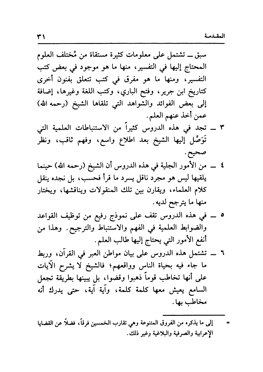 ٣ - تجدُ في هذه الدروسِ كثيرًا من الاستنباطاتِ العلميةِ التي تَوَصَّلَ إليها الشيخُ بعد اطلاعٍ واسعٍ، وَفَهْمٍ ثَاقِبٍ، وَنَظَرٍ صحيحٍ.