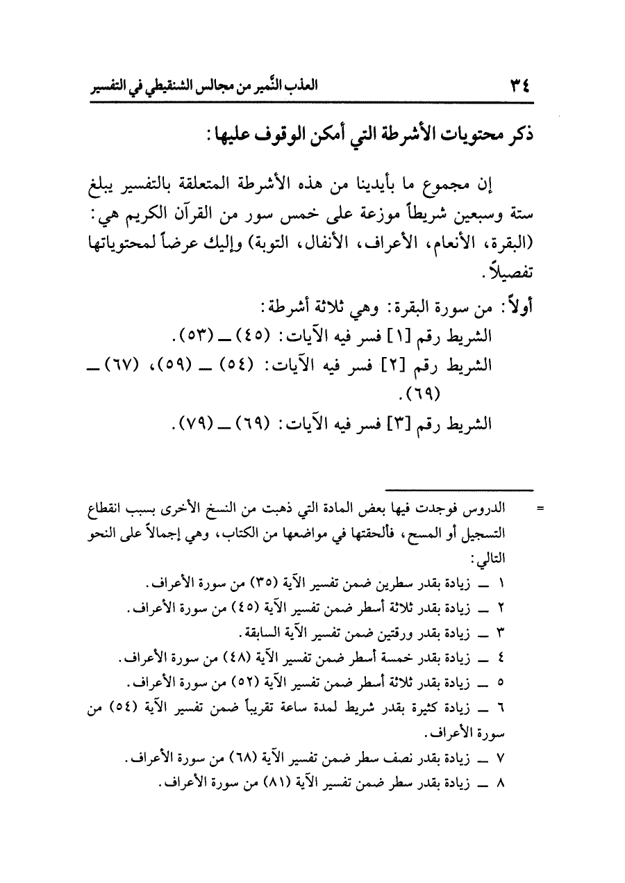 إن مجموعَ ما بِأَيْدِينَا من هذهِ الأشرطةِ المتعلقةِ بالتفسيرِ يبلغُ ستةً وسبعينَ شريطًا مُوَزَّعَةً على خمسِ سورٍ من القرآنِ الكريمِ هي: (البقرة، الأنعام، الأعراف، الأنفال، التوبة) وإليك عرضًا لمحتوياتِها تَفْصِيلاً: