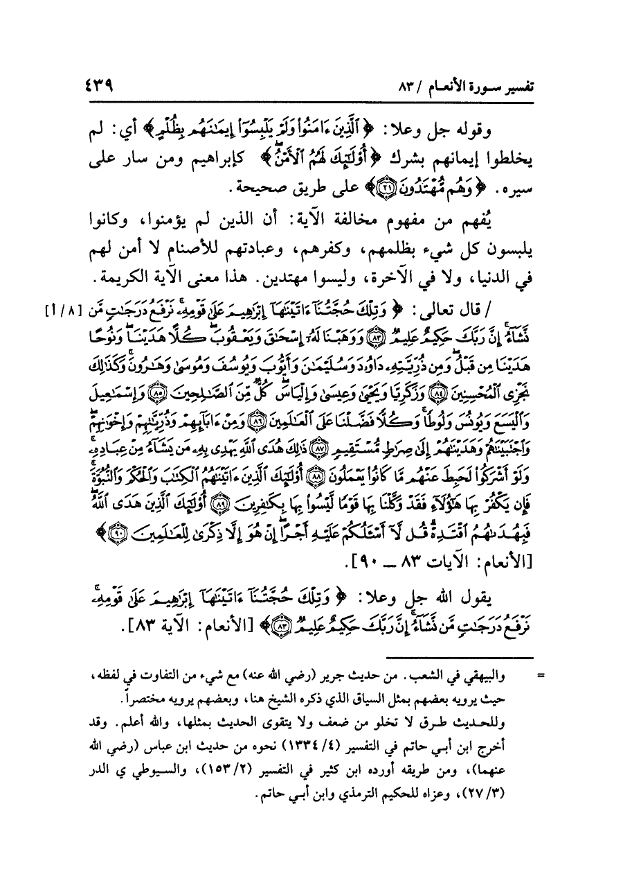 [٨/أ] / قال تعالى: {وَتِلْكَ حُجَّتُنَا آتَيْنَاهَا إِبْرَاهِيمَ عَلَى قَوْمِهِ نَرْفَعُ دَرَجَاتٍ مَنْ نَشَاءُ إِنَّ رَبَّكَ حَكِيمٌ عَلِيمٌ (٨٣) وَوَهَبْنَا لَهُ إِسْحَاقَ وَيَعْقُوبَ كُلاًّ هَدَيْنَا وَنُوحًا هَدَيْنَا مِنْ قَبْلُ وَمِنْ ذُرِّيَّتِهِ دَاوُدَ وَسُلَيْمَانَ وَأَيُّوبَ وَيُوسُفَ وَمُوسَى وَهَارُونَ وَكَذَلِكَ نَجْزِي الْمُحْسِنِينَ (٨٤) وَزَكَرِيَّا وَيَحْيَى وَعِيسَى وَإِلْيَاسَ كُلٌّ مِنَ الصَّالِحِينَ (٨٥) وَإِسْمَاعِيلَ وَالْيَسَعَ وَيُونُسَ وَلُوطًا وَكُلاًّ فَضَّلْنَا عَلَى الْعَالَمِينَ (٨٦) وَمِنْ آبَائِهِمْ وَذُرِّيَّاتِهِمْ وَإِخْوَانِهِمْ وَاجْتَبَيْنَاهُمْ وَهَدَيْنَاهُمْ إِلَى صِرَاطٍ مُسْتَقِيمٍ (٨٧) ذَلِكَ هُدَى اللَّهِ يَهْدِي بِهِ مَنْ يَشَاءُ مِنْ عِبَادِهِ وَلَوْ أَشْرَكُوا لَحَبِطَ عَنْهُمْ مَا كَانُوا يَعْمَلُونَ (٨٨) أُولَئِكَ الَّذِينَ آتَيْنَاهُمُ الْكِتَابَ وَالْحُكْمَ وَالنُّبُوَّةَ فَإِنْ يَكْفُرْ بِهَا هَؤُلَاءِ فَقَدْ وَكَّلْنَا بِهَا قَوْمًا لَيْسُوا بِهَا بِكَافِرِينَ (٨٩) أُولَئِكَ الَّذِينَ هَدَى اللَّهُ فَبِهُدَاهُمُ اقْتَدِهْ قُلْ لَا أَسْأَلُكُمْ عَلَيْهِ أَجْرًا إِنْ هُوَ إِلَاّ ذِكْرَى لِلْعَالَمِينَ (٩٠)} [الأنعام: الآيات ٨٣ - ٩٠].