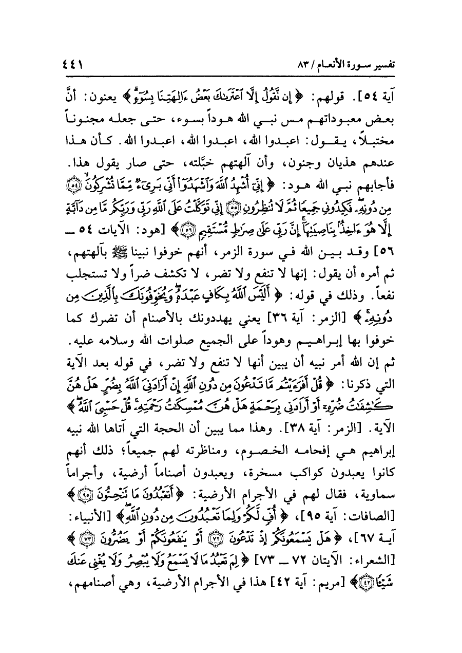 ثُمَّ إن اللَّهَ أمرَ نَبِيَّهُ أن يبينَ أنها لا تنفعُ ولا تضرُّ، في قولِه بعدَ الآيةِ التي ذَكَرْنَا: {قُلْ أَفَرَأَيْتُم مَّا تَدْعُونَ مِنْ دُونِ اللَّهِ إِنْ أَرَادَنِيَ اللَّهُ بِضُرٍّ هَلْ هُنَّ كَاشِفَاتُ ضُرِّهِ أَوْ أَرَادَنِي بِرَحْمَةٍ هَلْ هُنَّ مُمْسِكَاتُ رَحْمَتِهِ قُلْ حَسْبِيَ اللَّهُ} الآية. [الزمر: آية ٣٨]. وهذا مِمَّا يبين أن الحجةَ التي آتَاهَا اللَّهُ نَبِيَّهُ إبراهيمَ هي إفحامُه الخصومَ، ومناظرتُه لهم جميعًا؛ ذلك أنهم كانوا يعبدونَ كواكبَ مسخرةً، ويعبدونَ أصنامًا أرضيةً، وأجرامًا سماويةً، فقال لهم في الأجرامِ الأرضيةِ: {أَتَعْبُدُونَ مَا تَنْحِتُونَ} [الصافات: آية ٩٥] {أُفٍّ لَّكُمْ وَلِمَا تَعْبُدُونَ مِنْ دُونِ اللَّهِ} [الأنبياء: آية ٦٧] {هَلْ يَسْمَعُونَكُمْ إِذْ تَدْعُونَ أَوْ يَنْفَعُونَكُمْ أَوْ يَضُرُّونَ} [الشعراء: الآيتان ٧٢ - ٧٣] {لِمَ تَعْبُدُ مَا لَا يَسْمَعُ وَلَا يُبْصِرُ وَلَا يُغْنِي عَنْكَ شَيْئًا} [مريم: آية ٤٢] هذا في الأجرامِ الأرضيةِ، وهي أصنامُهم،
