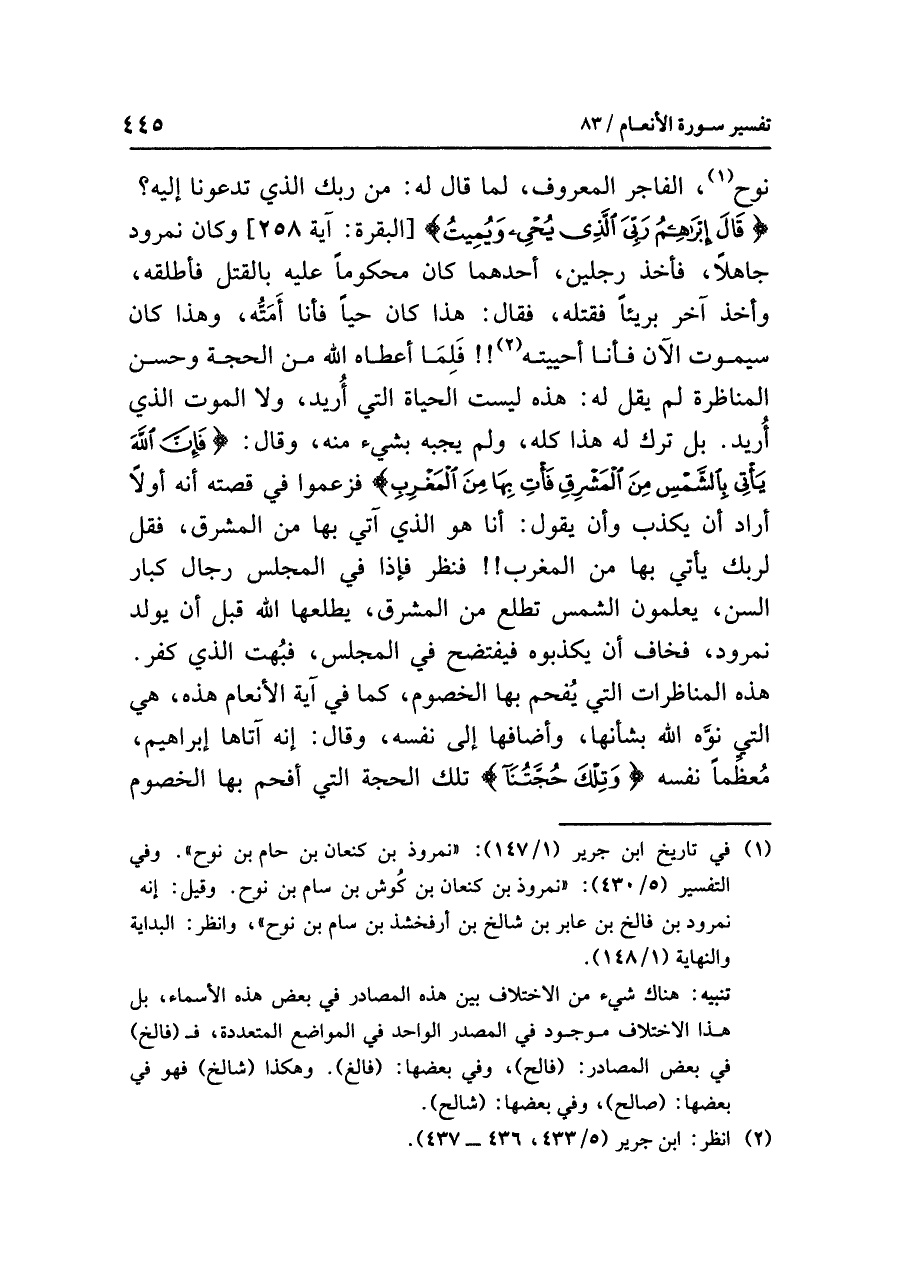 الفاجرُ المعروفُ، لَمَّا قال له: مَنْ رَبُّكَ الذي تَدْعُونَا إليه؟ {قَالَ إِبْرَاهِيمُ رَبِّيَ الَّذِي يُحْيِي وَيُمِيتُ} [البقرة: آية ٢٥٨] وكان نمرودُ جاهلاً، فَأَخَذَ رَجُلَيْنِ، أحدُهما كان محكومًا عليه بالقتلِ فأطلقَه، وأخذ آخَرَ بريئًا فَقَتَلَهُ، فقال: هذا كان حَيًّا فأنا أَمَتُّهُ، وهذا كان سيموتُ الآنَ فأنا أَحْيَيْتُهُ (¬٢)!! فَلِمَا أَعْطَاهُ اللَّهُ من الحجةِ وحسنِ المناظرةِ لم يَقُلْ له: هذه ليست الحياةَ التي أُرِيدُ، ولا الموتَ الذي أُرِيدُ. بل تَرَكَ له هذا كُلَّهُ، ولم يُجِبْهُ بشيءٍ منه، وقال: {فَإِنَّ اللَّهَ يَأْتِي بِالشَّمْسِ مِنَ الْمَشْرِقِ فَأْتِ بِهَا مِنَ الْمَغْرِبِ} فَزَعَمُوا في قصتِه أنه أَوَّلاً أرادَ أن يكذبَ وأن يقولَ: أنا هو الذي آتِي بها من المشرقِ، فَقُلْ لِرَبِّكَ يأتِي بها من المغربِ!! فَنَظَرَ فإذا في المجلسِ رجالٌ كبارُ السِّنِّ، يعلمونَ الشمسَ تطلعُ من المشرقِ، يُطْلِعُهَا اللَّهُ قبلَ أن يولدَ نمرود، فَخَافَ أن يُكَذِّبُوهُ فيفتضحُ في المجلسِ، فَبُهِتَ الذي كَفَرَ. هذه المناظراتُ التي يُفْحَمُ بها الخصومُ، كما في آيةِ الأنعامِ هذه، هي التي نَوَّهَ اللَّهُ بشأنِها، وأضافَها إلى نفسِه، وقال: إنه آتَاهَا إبراهيمَ، مُعَظِّمًا نفسَه: {وَتِلْكَ حُجَّتُنَا} تلك الحجةُ التي أَفْحَمَ بها الخصومَ