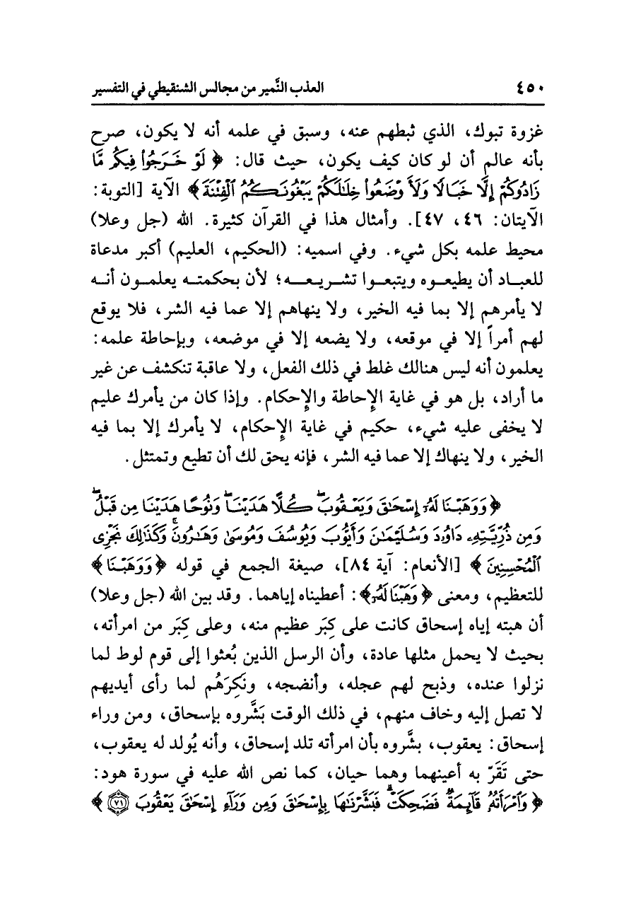 {وَوَهَبْنَا لَهُ إِسْحَاقَ وَيَعْقُوبَ كُلاًّ هَدَيْنَا وَنُوحًا هَدَيْنَا مِنْ قَبْلُ وَمِنْ ذُرِّيَّتِهِ دَاوُدَ وَسُلَيْمَانَ وَأَيُّوبَ وَيُوسُفَ وَمُوسَى وَهَارُونَ وَكَذَلِكَ نَجْزِي الْمُحْسِنِينَ} [الأنعام: آية ٨٤]، صيغةُ الجمعِ في قولِه: {وَوَهَبْنَا} للتعظيمِ، ومعنَى {وَهَبْنَا لَهُ}: أَعْطَيْنَاهُ إِيَّاهُمَا. وَقَدْ بَيَّنَ اللَّهُ (جل وعلا) أن هبتَه إياه إسحاقَ كانت على كِبَرٍ عَظِيمٍ منه، وعلى كِبَرٍ من امرأتِه، بحيثُ لا يحملُ مِثْلُهَا عادةً، وأن الرسلَ الذين بُعِثُوا إلى قومِ لوطٍ لَمَّا نزلوا عندَه، وذبحَ لهم عِجْلَهُ وَأَنْضَجَهُ ونَكِرَهُم لَمَّا رَأَى أيديَهم لا تَصِلُ إليه وَخَافَ منهم، في ذلك الوقتِ بَشَّروهُ بإسحاقَ، وَمِنْ وراءِ إسحاقَ: يعقوبَ، بَشَّرُوهُ بأن امرأتَه تَلِدُ إسحاقَ، وأنه يُولَدُ له يعقوبُ، حتى تَقَرَّ به أعينُهما وَهُمَا حَيَّانِ، كما نَصَّ اللَّهُ عليه في سورةِ هودٍ: