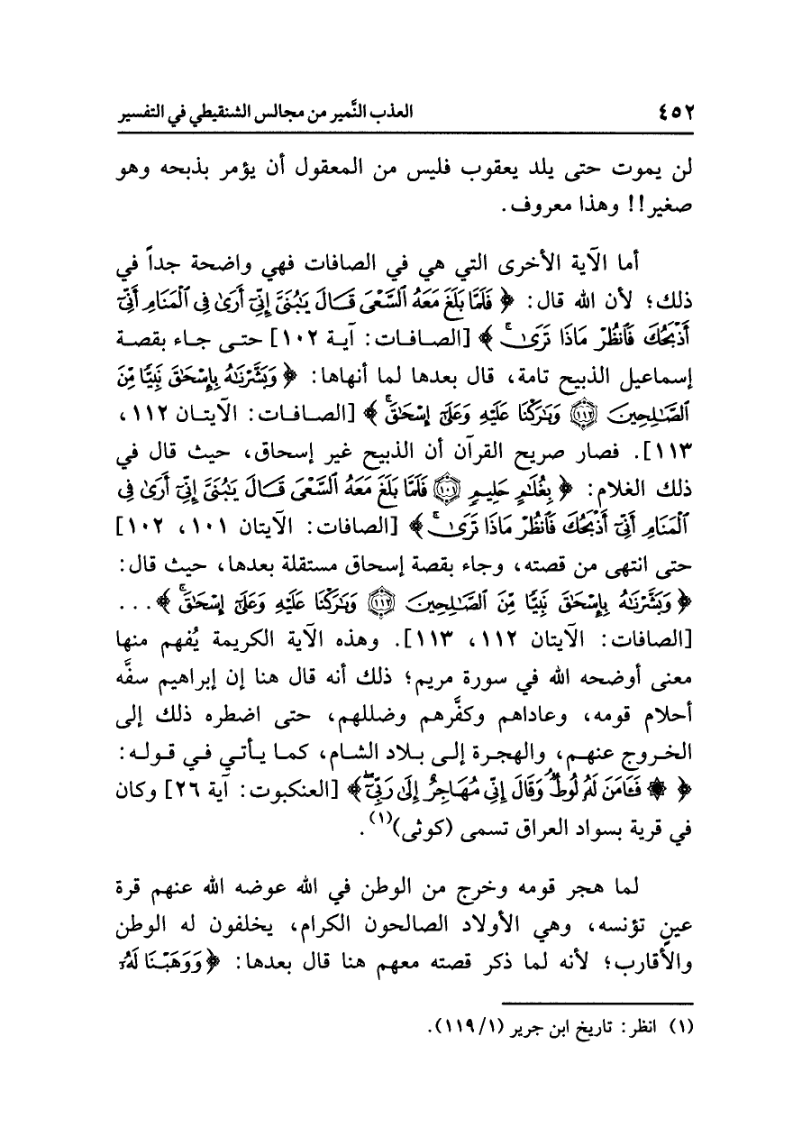أما الآيةُ الأُخْرَى التي هِيَ في الصافاتِ فهي واضحةٌ جِدًّا في ذلك؛ لأَنَّ اللَّهَ قال: {فَلَمَّا بَلَغَ مَعَهُ السَّعْيَ قَالَ يَا بُنَيَّ إِنِّي أَرَى فِي الْمَنَامِ أَنِّي أَذْبَحُكَ فَانْظُرْ مَاذَا تَرَى} [الصافات: آية ١٠٢] حتى جَاءَ بقصةِ إسماعيلَ الذبيحِ تَامَّةً، قال بَعْدَهَا لَمَّا أَنْهَاهَا: {وَبَشَّرْنَاهُ بِإِسْحَاقَ نَبِيًّا مِنَ الصَّالِحِينَ (١١٢) وَبَارَكْنَا عَلَيْهِ وَعَلَى إِسْحَاقَ (١١٣)} [الصافات: الآيتان ١١٢، ١١٣]. فَصَارَ صريحُ القرآنِ أَنَّ الذبيحَ غيرُ إسحاقَ، حيثُ قَالَ في ذلك الغلامِ: {بِغُلَامٍ حَلِيمٍ (١٠١) فَلَمَّا بَلَغَ مَعَهُ السَّعْيَ قَالَ يَا بُنَيَّ إِنِّي أَرَى فِي الْمَنَامِ أَنِّي أَذْبَحُكَ فَانْظُرْ مَاذَا تَرَى} [الصافات: الآيتان ١٠١، ١٠٢] حَتَّى انْتَهَى من قصتِه، وَجَاءَ بقصةِ إسحاقَ مستقلةً بَعْدَهَا، حيثُ قال: {وَبَشَّرْنَاهُ بِإِسْحَاقَ نَبِيًّا مِنَ الصَّالِحِينَ (١١٢) وَبَارَكْنَا عَلَيْهِ وَعَلَى إِسْحَاقَ} ... [الصافات: الآيتان ١١٢، ١١٣]. وهذه الآيةُ الكريمةُ يُفْهَمُ منها معنًى أَوْضَحَهُ اللَّهُ في سورةِ مريمَ؛ ذلك أنه قال هنا إِنَّ إبراهيمَ سَفَّهَ أَحْلَامَ قومِه، وَعَادَاهُمْ وَكَفَّرَهُمْ وَضَلَّلَهُمْ، حتى اضطره ذلك إلى الخروجِ عنهم، والهجرةِ إلى بلادِ الشامِ، كما يأتِي في قولِه: {فَآمَنَ لَهُ لُوطٌ وَقَالَ إِنِّي مُهَاجِرٌ إِلَى رَبِّي} [العنكبوت: آية ٢٦] وَكَانَ فِي قريةٍ بسوادِ العراقِ تُسَمَّى (كوثى) (¬١).
