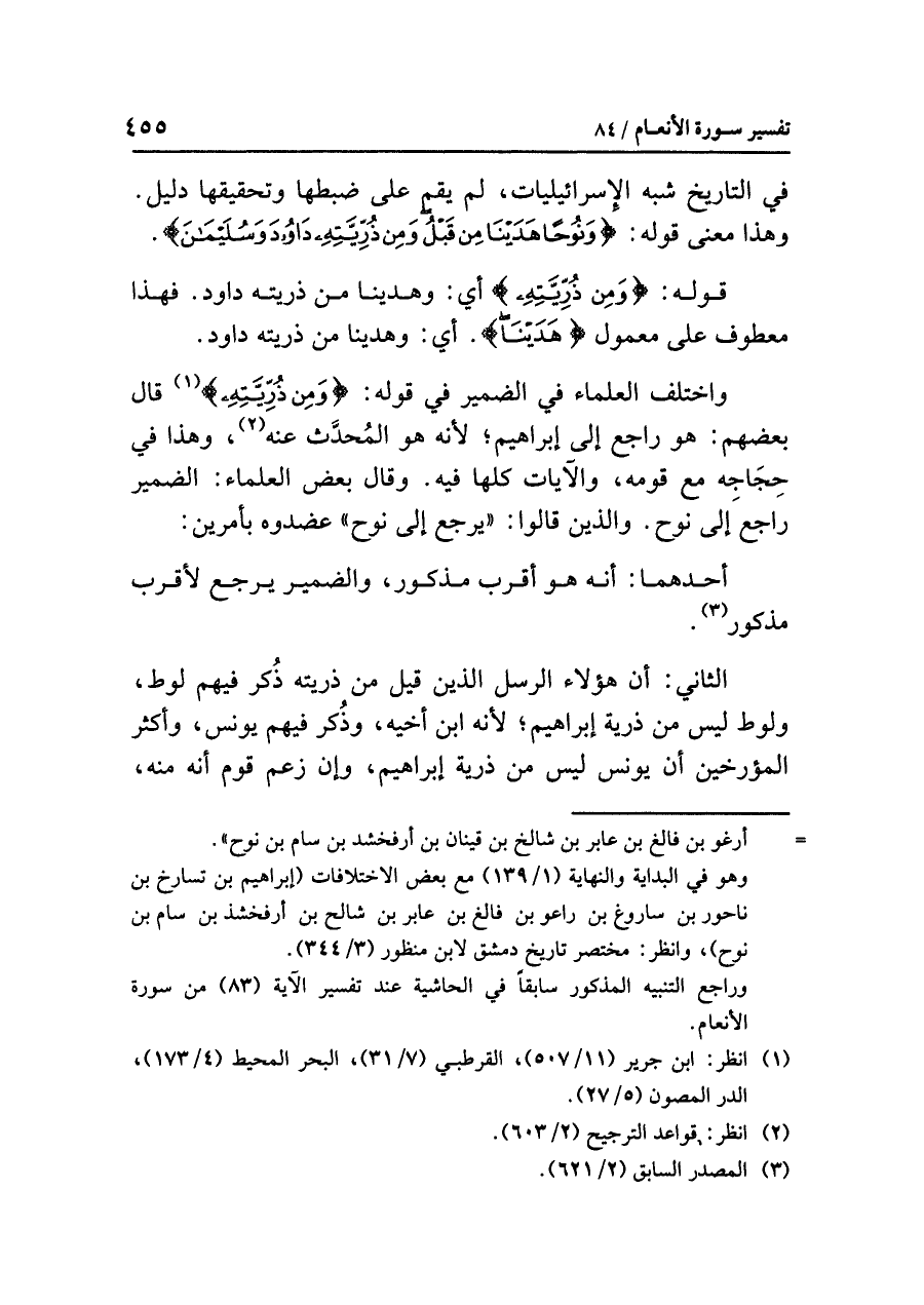 واختلفَ العلماءُ في الضميرِ في قولِه: {وَمِنْ ذُرِّيَّتِهِ} (¬١) قال بعضُهم: هو راجعٌ إلى إبراهيمَ؛ لأنه هو الْمُحَدَّثُ عنه (¬٢)، وهذا في حِجَاجِهِ مع قومِه، والآياتُ كُلُّهَا فيه. وقال بعضُ العلماءِ: الضميرُ راجعٌ إلى نوحٍ. والذين قالوا: «يَرْجِعُ إِلَى نُوحٍ» عَضَّدُوهُ بِأَمْرَيْنِ: