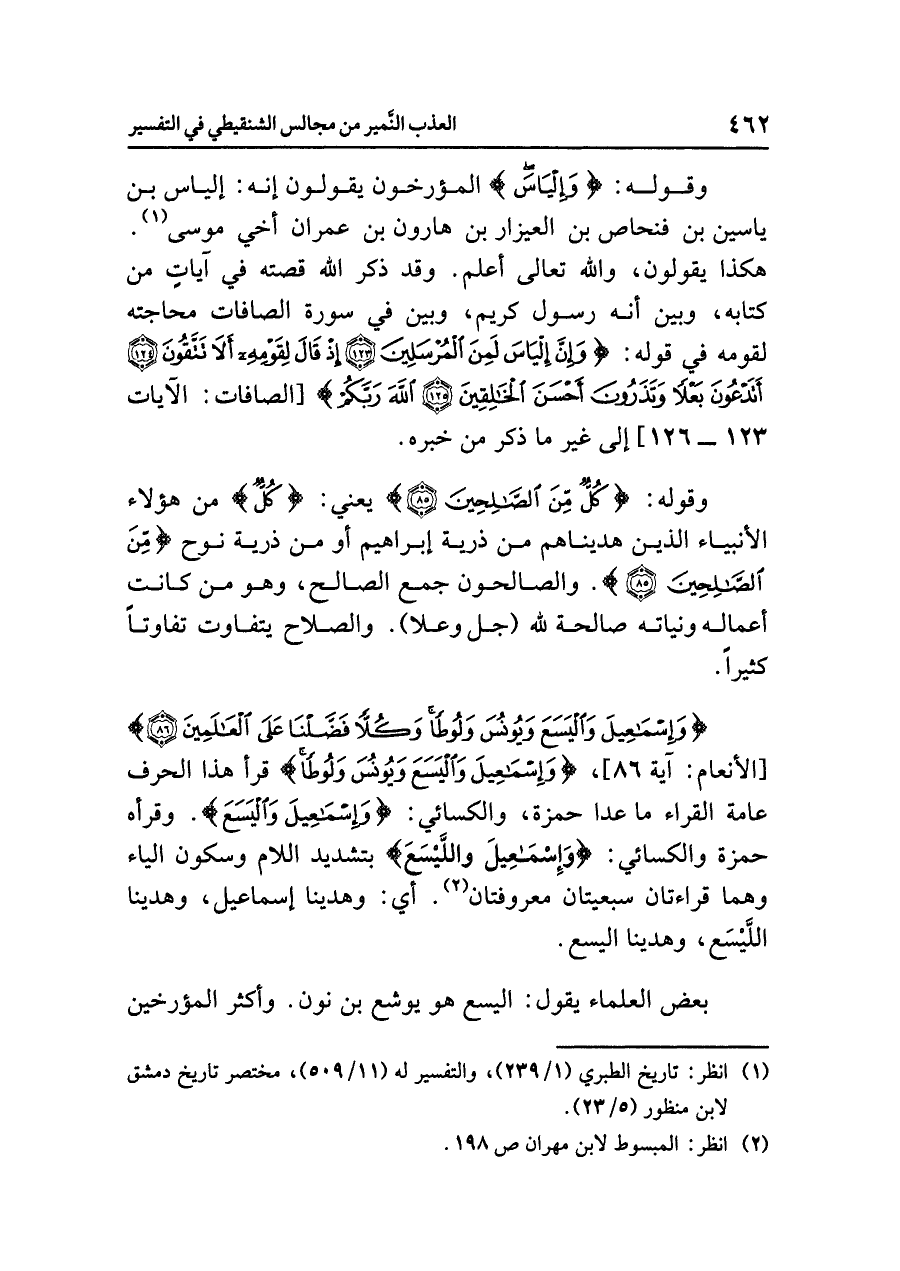 وقولُه: {وَإِلْيَاسَ} المؤرخونَ يقولونَ إنه: إلياسُ بنُ ياسينَ بنِ فنحاصَ بنِ العيزارِ بنِ هارونَ بنِ عمرانَ أخي مُوسَى (¬١). هكذا يقولونَ، وَاللَّهُ تعالى أَعْلَمُ. وقد ذَكَرَ اللَّهُ قصتَه في آياتٍ من كتابِه، وَبَيَّنَ أنه رسولٌ كريمٌ، وَبَيَّنَ في سورةِ الصافاتِ محاجتَه لقومِه في قولِه: {وَإِنَّ إِلْيَاسَ لَمِنَ الْمُرْسَلِينَ (١٢٣) إِذْ قَالَ لِقَوْمِهِ أَلَا تَتَّقُونَ (١٢٤) أَتَدْعُونَ بَعْلاً وَتَذَرُونَ أَحْسَنَ الْخَالِقِينَ (١٢٥) اللَّهَ رَبَّكُمْ} [الصافات: الآيات ١٢٣ - ١٢٦] إلى غيرِ مَا ذَكَرَ مِنْ خَبَرِهِ.