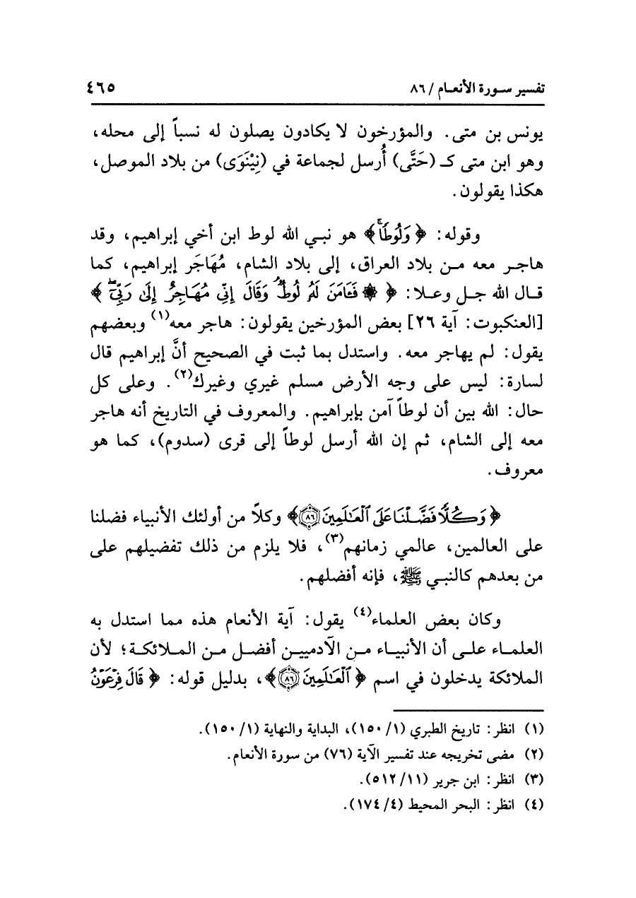 وقولُه: {وَلُوطًا} هو نَبِيُّ اللَّهِ لوطُ ابنُ أَخِي إبراهيمَ، وقد هَاجَرَ مَعَهُ من بلادِ العراقِ إلى بلادِ الشامِ، مُهَاجَرَ إبراهيمَ، كما قَالَ اللَّهُ جل وعلا: {فَآمَنَ لَهُ لُوطٌ وَقَالَ إِنِّي مُهَاجِرٌ إِلَى رَبِّي} [العنكبوت: آية ٢٦] بعضُ المؤرخين يقولونَ: هَاجَرَ مَعَهُ (¬١)، وبعضُهم يقولُ: لم يُهَاجِرْ مَعَهُ. وَاسْتَدَلَّ بما ثَبَتَ في الصحيحِ أنَّ إبراهيمَ قال لِسَارَّةَ: ليس على وجهِ الأرضِ مسلمٌ غَيْرِي وَغَيْرُكِ (¬٢). وعلى كُلِّ حالٍ: اللَّهُ بَيَّنَ أَنَّ لُوطًا آمَنَ بإبراهيمَ.