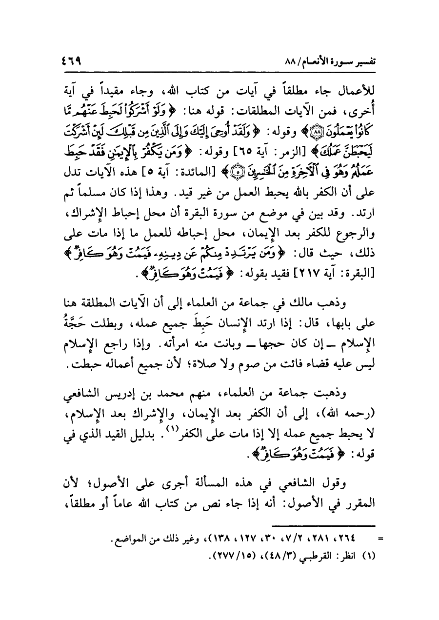 وَذَهَبَتْ جماعةٌ من العلماءِ، منهم محمدُ بنُ إدريسَ الشافعيُّ (رحمه الله)، إلى أن الكفرَ بعدَ الإيمانِ، والإشراكَ بعدَ الإسلامِ لَا يُحْبِطُ جميعَ عملِه إلا إذا مَاتَ على الكفرِ (¬١). بدليلِ القيدِ الذي في قولِه: {فَيَمُتْ وَهُوَ كَافِرٌ}.