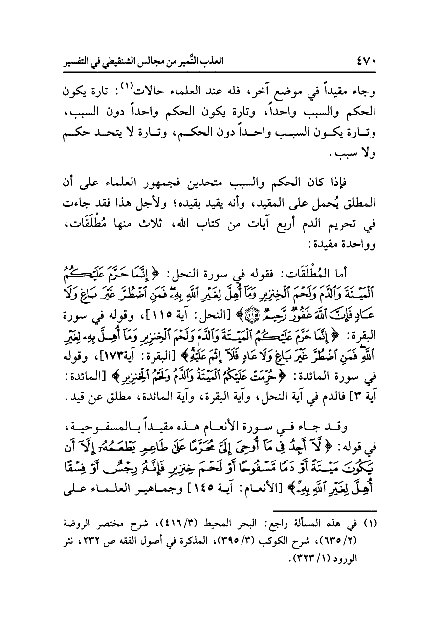 أَمَّا المُطْلَقَاتُ: فقولُه في سورةِ النحلِ: {إِنَّمَا حَرَّمَ عَلَيْكُمُ الْمَيْتَةَ وَالْدَّمَ وَلَحْمَ الْخَنْزِيرِ وَمَا أُهِلَّ لِغَيْرِ اللَّهِ بِهِ فَمَنِ اضْطُرَّ غَيْرَ بَاغٍ وَلَا عَادٍ فَإِنَّ اللَّهَ غَفُورٌ رَّحِيمٌ} [النحل: آية ١١٥] وقولُه في سورةِ البقرةِ: {إِنَّمَا حَرَّمَ عَلَيْكُمُ الْمَيْتَةَ وَالدَّمَ وَلَحْمَ الْخِنْزِيرِ وَمَا أُهِلَّ بِهِ لِغَيْرِ اللَّهِ فَمَنِ اضْطُرَّ غَيْرَ بَاغٍ وَلَا عَادٍ فَلَا إِثْمَ عَلَيْهِ إِنَّ اللَّهَ غَفُورٌ رَّحِيمٌ} [البقرة: آية ١٧٣] وقولُه في سورةِ المائدةِ: {حُرِّمَتْ عَلَيْكُمُ الْمَيْتَةُ وَالْدَّمُ وَلَحْمُ الْخِنْزِيرِ} [المائدة: آية ٣] فالدمُ في آيةِ النحلِ، وآيةِ البقرةِ، وآيةِ المائدةِ، مُطْلَقٌ عَنْ قَيْدٍ.