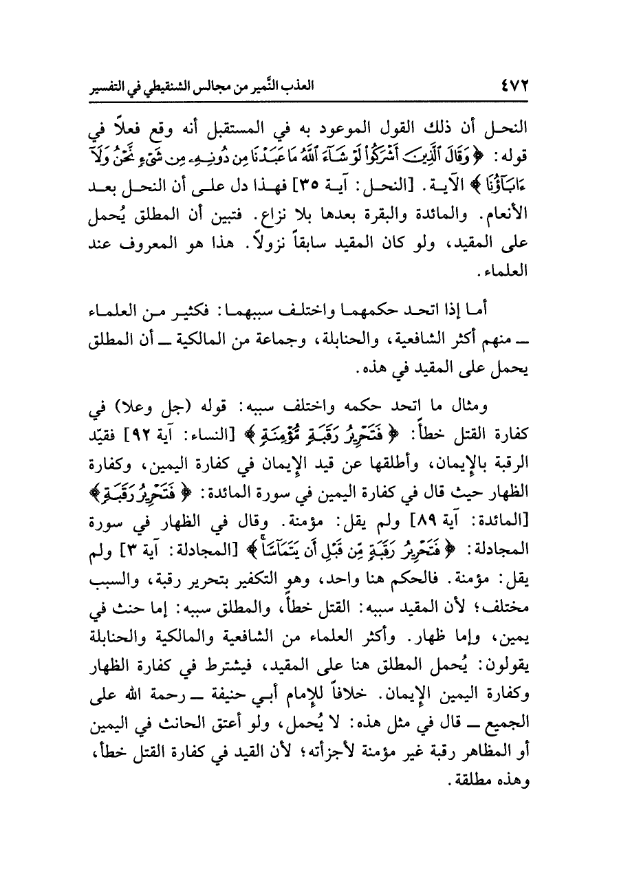 ومثالُ ما اتَّحَدَ حُكْمُهُ واختلفَ سَبَبُهُ: قولُه (جل وعلا) في كفارةِ القتلِ خَطَأً: {فَتَحْرِيرُ رَقَبَةٍ مُّؤْمِنَةٍ} [النساء: آية ٩٢] فَقَيَّدَ الرقبةَ بالإيمانِ، وَأَطْلَقَهَا عن قيدِ الإيمانِ في كفارةِ اليمينِ، وكفارةُ الظهارِ حيثُ قال في كفارةِ اليمينِ في سورةِ المائدةِ: {أَوْ تَحْرِيرُ رَقَبَةٍ} [المائدة: آية ٨٩] وَلَمْ يَقُلْ: مؤمنةٍ. وقال في الظهارِ في سورةِ المجادلةِ: {فَتَحْرِيرُ رَقَبَةٍ مِّنْ قَبْلِ أَن يَتَمَاسَّا} [المجادلة: آية ٣] ولم يَقُلْ: مؤمنةٍ. فالحكمُ هنا واحدٌ، وهو التكفيرُ بتحريرِ رقبةٍ، والسببُ مختلفٌ؛ لأَنَّ الْمُقَيَّدَ سببُه: القتلُ خَطَأً، والمطلقُ سببُه: إما حِنْثٌ في يمينٍ، وإما ظهارٌ. وأكثرُ العلماءِ من الشافعيةِ والمالكيةِ والحنابلةِ يقولونَ: يُحْمَلُ المطلقُ هنا على المقيدِ، فَيُشْتَرَطُ في كفارةِ الظهارِ وكفارةِ اليمينِ الإيمانُ. خِلَافًا للإمامِ أَبِي حنيفةَ - رحمةُ اللَّهِ عَلَى الجميعِ - قال في مثلِ هذه: لَا يُحْمَلُ، ولو أَعْتَقَ الحانثُ في اليمينِ أو المظاهرُ رقبةً غيرَ مؤمنةٍ لأَجْزَأَتْهُ؛ لأن القيدَ في كفارةِ القتلِ خطأً، وهذه مُطْلَقَةٌ.