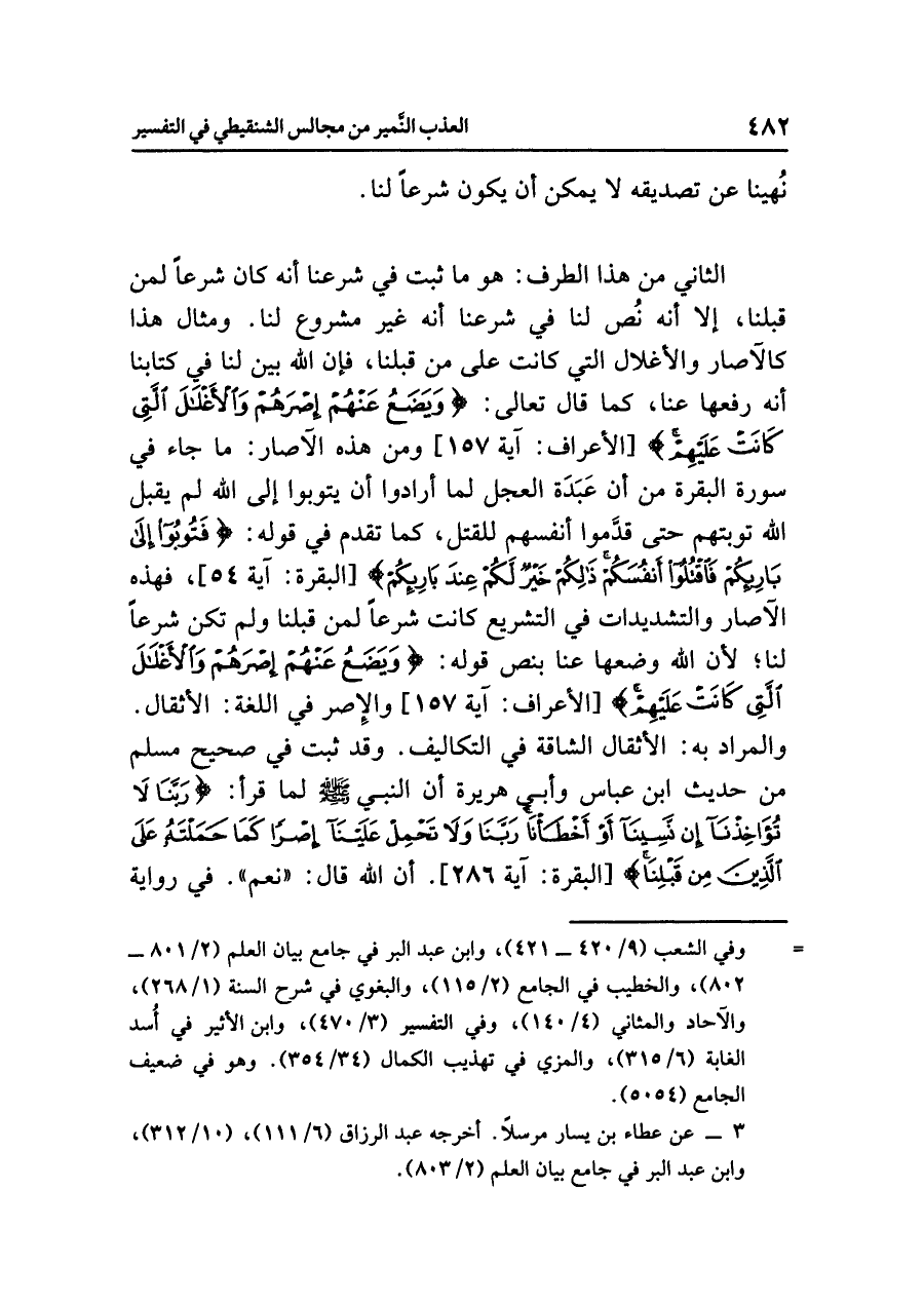 الثاني من هذا الطَّرَفِ: هو ما ثَبَتَ في شَرْعِنَا أنه كان شَرْعًا لِمَنْ قَبْلَنَا، إلا أنه نُصَّ لنا في شَرْعِنَا أنه غيرُ مشروعٍ لنا. ومثالُ هذا كالآصَارِ والأغلالِ التي كانت على مَنْ قَبْلَنَا، فإن اللَّهَ بَيَّنَ لنا في كتابِنا أنه رَفَعَهَا عَنَّا، كما قَالَ تَعَالَى: {وَيَضَعُ عَنْهُمْ إِصْرَهُمْ وَالأَغْلَالَ الَّتِي كَانَتْ عَلَيْهِمْ} [الأعراف: آية ١٥٧] ومن هذه الآصارِ: ما جَاءَ في سورةِ البقرةِ من أَنَّ عَبَدَةَ العجلِ لَمَّا أَرَادُوا أن يَتُوبُوا إلى اللَّهِ لَمْ يَقْبَلِ اللَّهُ تَوْبَتَهُمْ حَتَّى قَدَّمُوا أنفسَهم للقتلِ، كما تَقَدَّمَ في قولِه: {فَتُوبُوا إِلَى بَارِئِكُمْ فَاقْتُلُوا أَنفُسَكُمْ ذَلِكُمْ خَيْرٌ لَّكُمْ عِنْدَ بَارِئِكُمْ} [البقرة: آية ٥٤]،