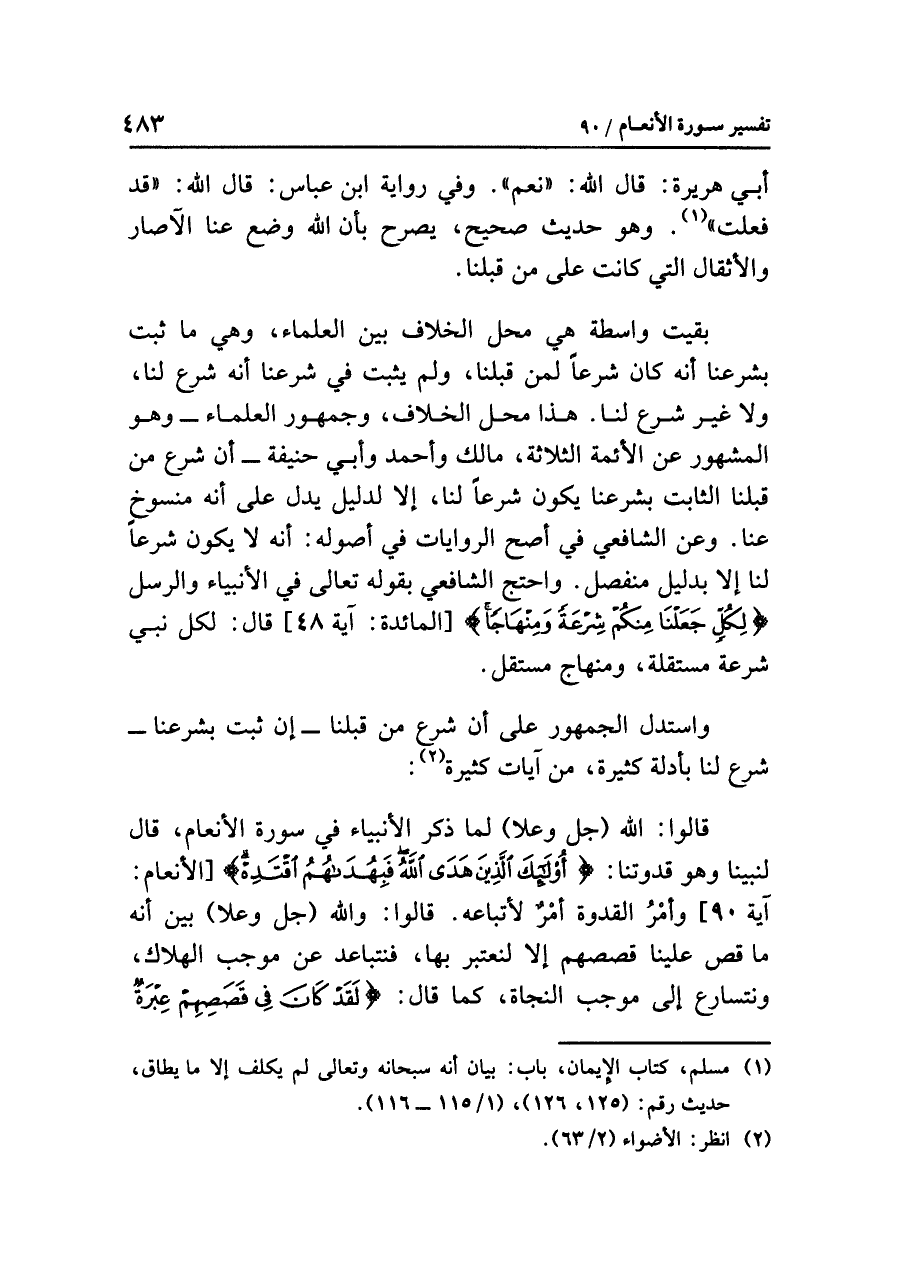 بَقِيَتْ واسطةٌ هِيَ مَحَلُّ الخلافِ بَيْنَ العلماءِ، وهي ما ثَبَتَ بِشَرْعِنَا أنه كان شَرْعًا لِمَنْ قَبْلَنَا، ولم يَثْبُتْ فِي شَرْعِنَا أنه شرعٌ لنا، ولا غيرِ شَرْعٍ لَنَا. هذا محلُّ الخلافِ، وجمهورُ العلماءِ - وهو المشهورُ عن الأئمةِ الثلاثةِ، مَالِكٍ وَأَحْمَدَ وَأَبِي حَنِيفَةَ - أَنَّ شَرْعَ مَنْ قَبْلَنَا الثابتَ بِشَرْعِنَا يكونُ شَرْعًا لَنَا، إلا لدليلٍ يَدُلُّ على أنه منسوخٌ عَنَّا. وعن الشافعيِّ في أَصَحِّ الرواياتِ في أصولِه: أنه لَا يكونُ شَرْعًا لَنَا إِلَاّ بدليلٍ منفصلٍ. واحتجَّ الشافعيُّ بقولِه تعالى فِي الأنبياءِ والرسلِ: {لِكُلٍّ جَعَلْنَا مِنْكُمْ شِرْعَةً وَمِنْهَاجًا} [المائدة: آية ٤٨] قال: لِكُلِّ نَبِيٍّ شِرْعَةٌ مُسْتَقِلَّةٌ وَمِنْهَاجٌ مُسْتَقِلٌّ.